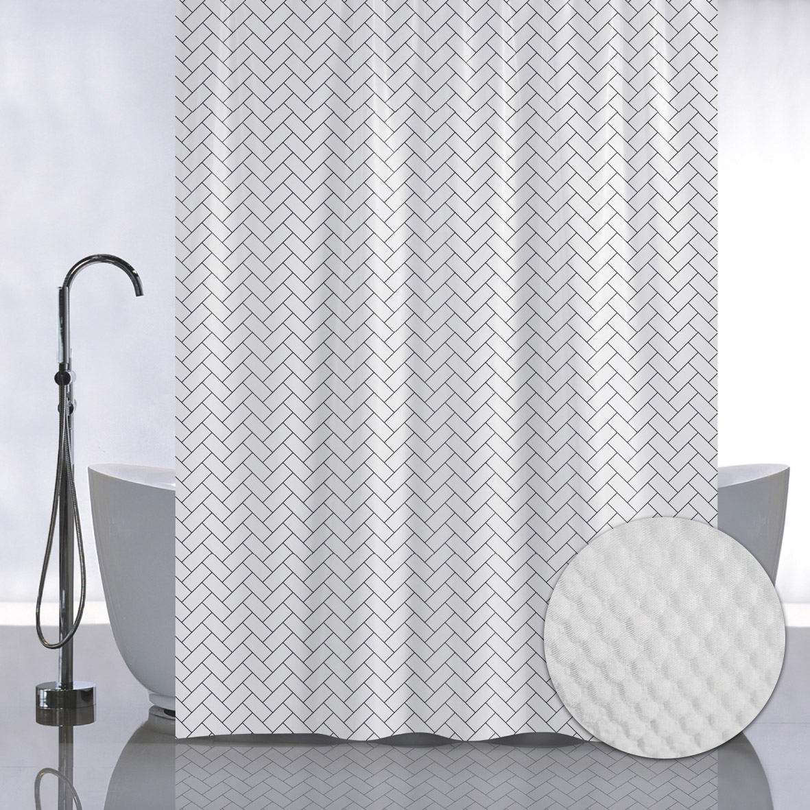 Штора с рельефным теснением, принт БЕЛЫЕ ПРЯМОУГОЛЬНИКИ, в ванную комнату, без колец, полиэстер/микрофибра, 180х180 см.