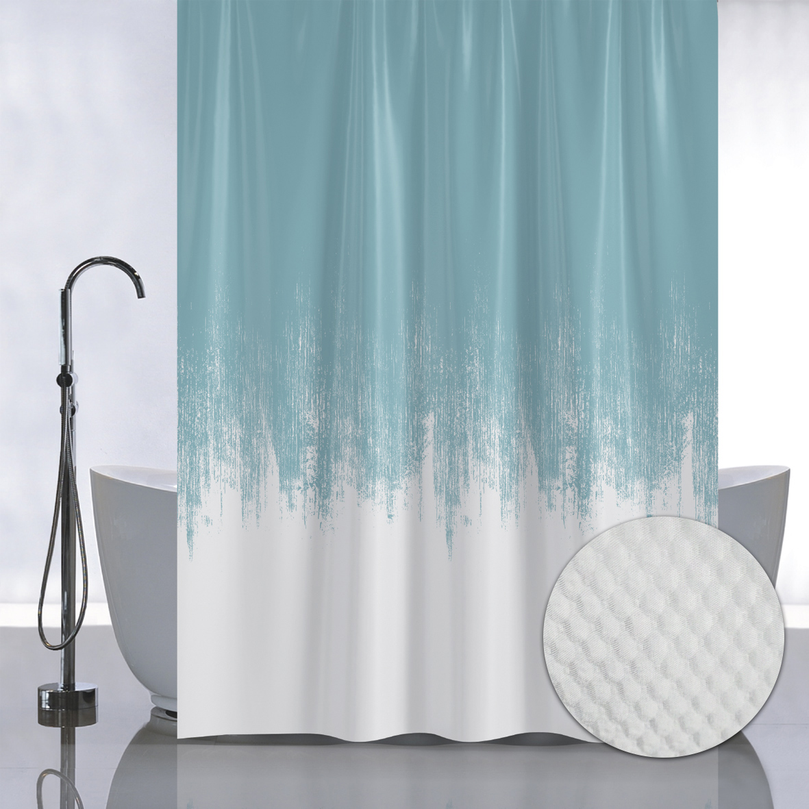 Штора с рельефным теснением, принт ПЕРЕХОД - БИРЮЗА, в ванную комнату, без колец, полиэстер/микрофибра, 180х180 см