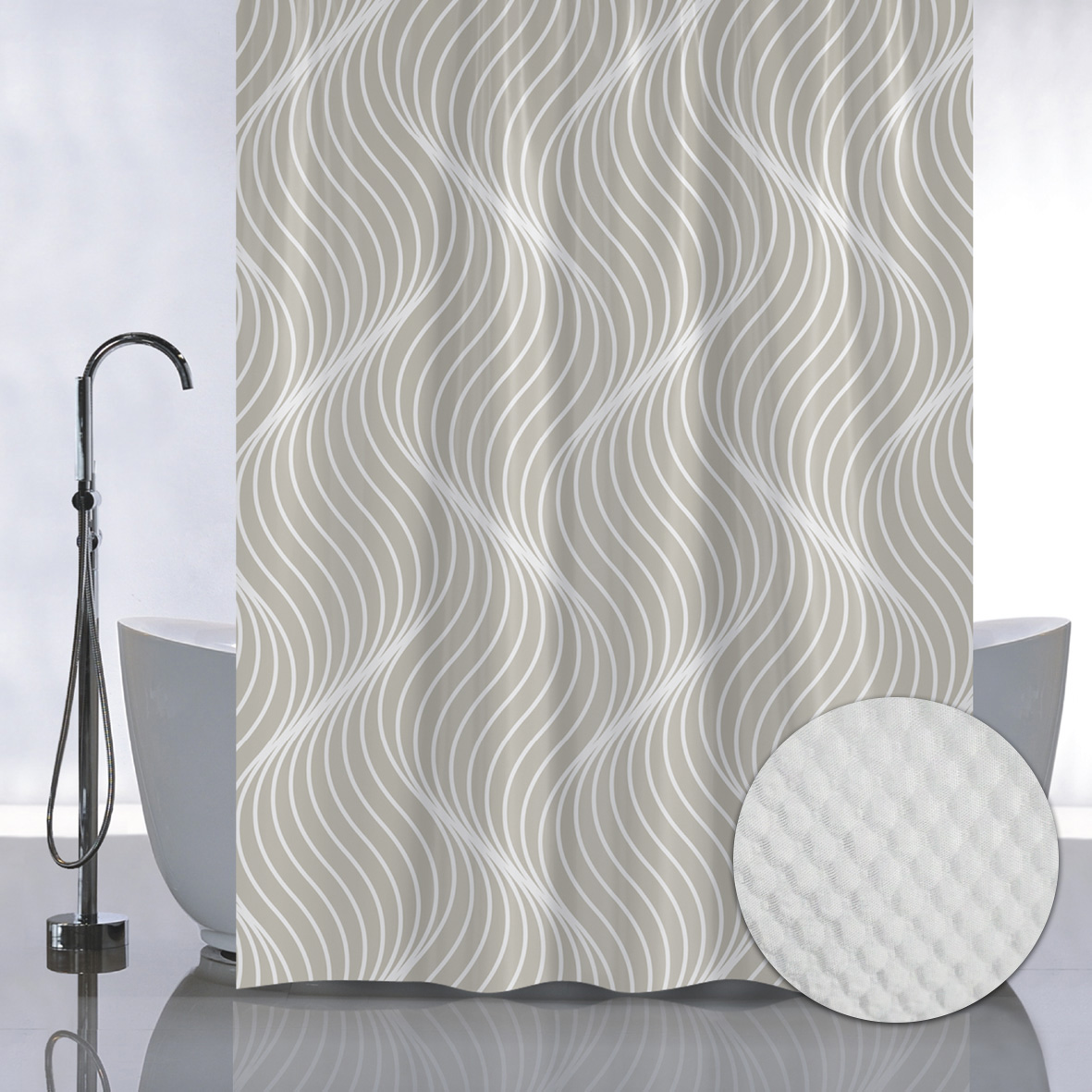 Штора с рельефным теснением, принт ВОЛНИСТЫЕ ЛИНИИ на БЕЖЕВОМ ФОНЕ, в ванную комнату, без колец, полиэстер/микрофибра, 180х180 см