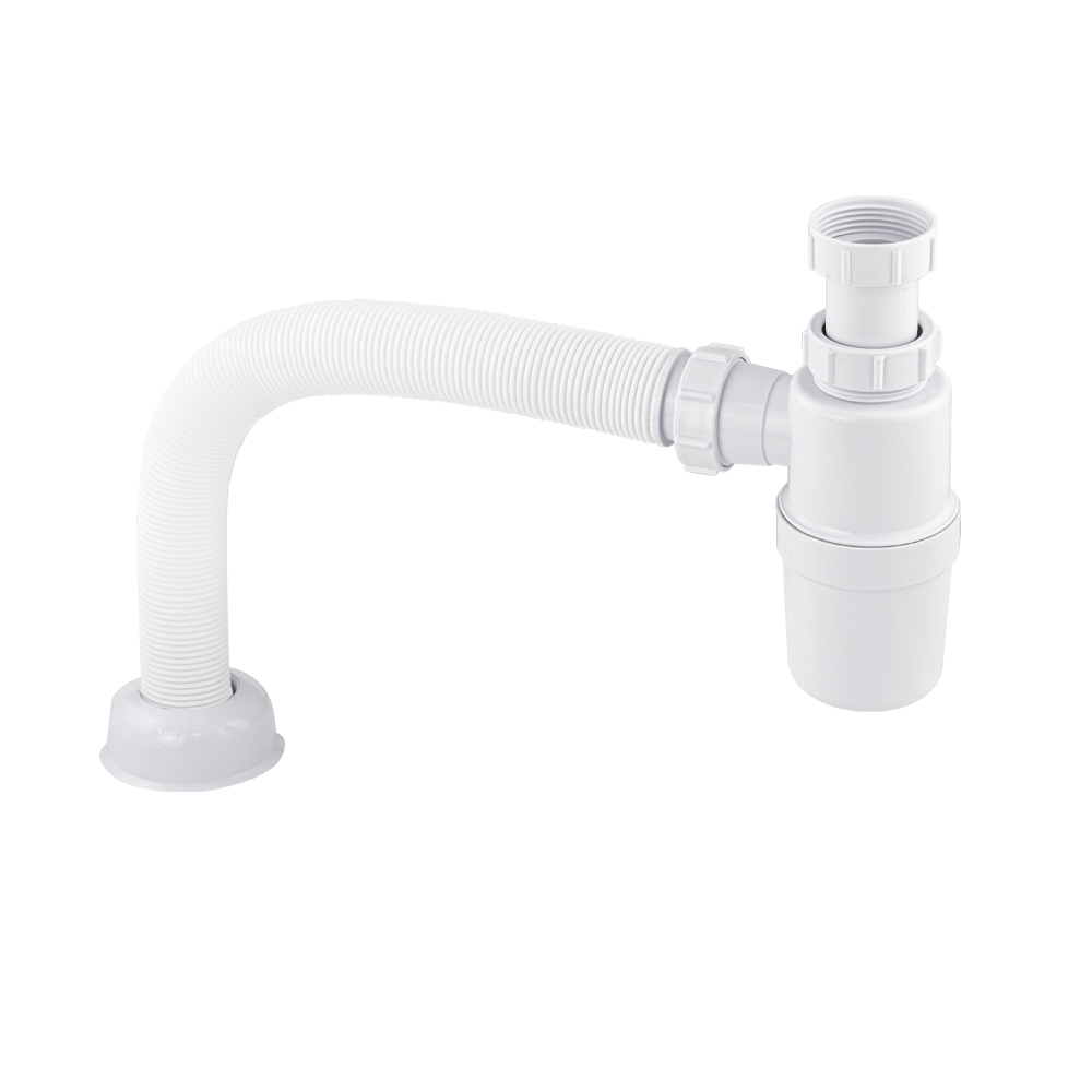 Сифон для раковины, белый, бутылочного типа. С разборным выпуском без горловины, из высокопрочного пластика АБС с бутылочным гидрозатвором от проникновения запахов. Форма сифона позволяет поддерживать хорошую пропускную способность слива сточной воды, выполняя свою главную функцию - формирование гидрозатвора для отсечения неприятных запахов из канализации. Конструкция позволяет легко, без демонтажа, снять отстойник (стакан) и почистить сифон в случае засорения, достать случайно упавшие в слив раковины мелкие ценные вещи. Сифон прост в установке. Габаритные размеры: длина мм, высота стакана мм, верхняя крышка мм. Комплект: сифон, уплотнения. Вес - 0,3 кг, объём - 0,00336 м3.