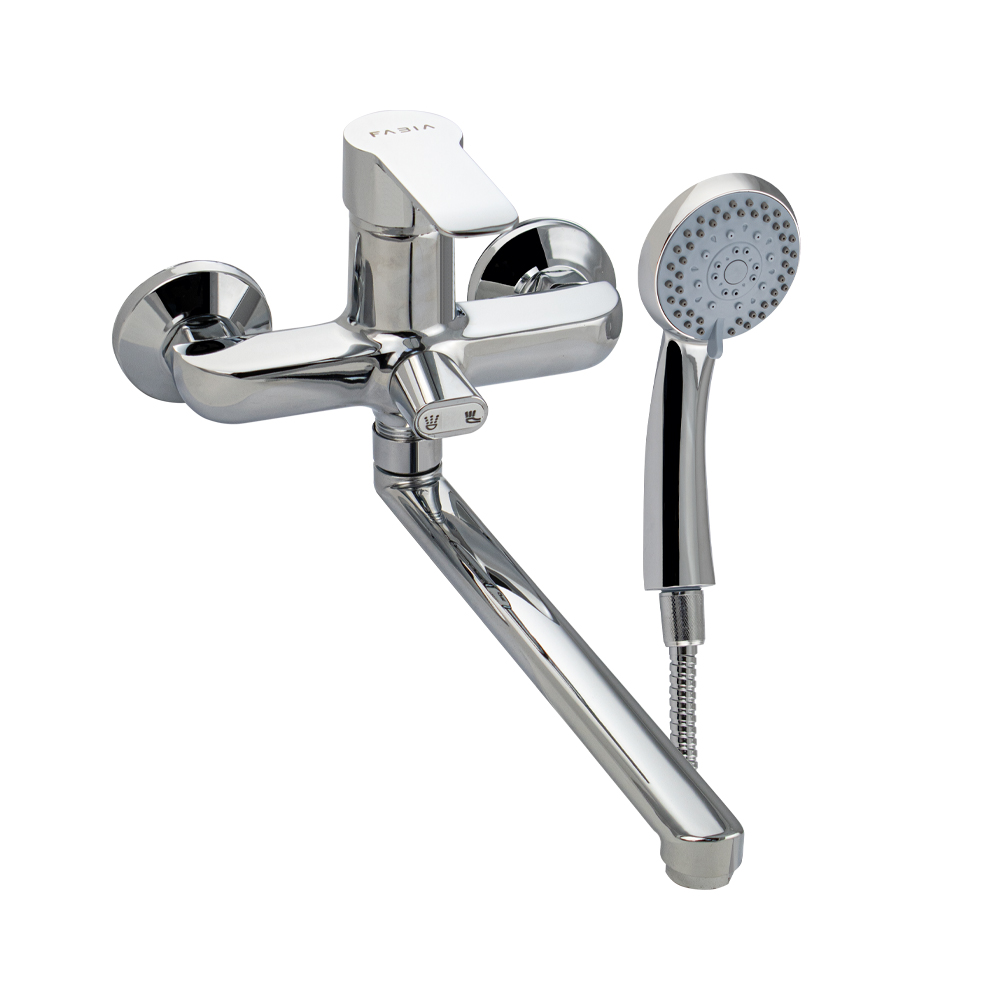 Смеситель хромированный в ванную / душевую комнату с длинным, плоским изливом, тяжёлый, массивный корпус, шаровый, с дивертором м/к на корпусе. Материал изготовления — ЦАМ (цинк-алюминий-медь). Картридж d = 35 мм, литая ручка, аэратор для экономии воды, чашки и эксцентрики из нержавеющей стали. Габаритные размеры: ширина 150 мм, высота корпуса 160 мм, длина излива 300 мм, душевая лейка d = 75 мм, шланг 150 см. Вес - 1,800 кг, объём - 0,00434 м3. В комплекте паспорт, корпус с изливом, дивертор, душевая лейка, шланг, кронштейн, комплект крепежа и прокладок.