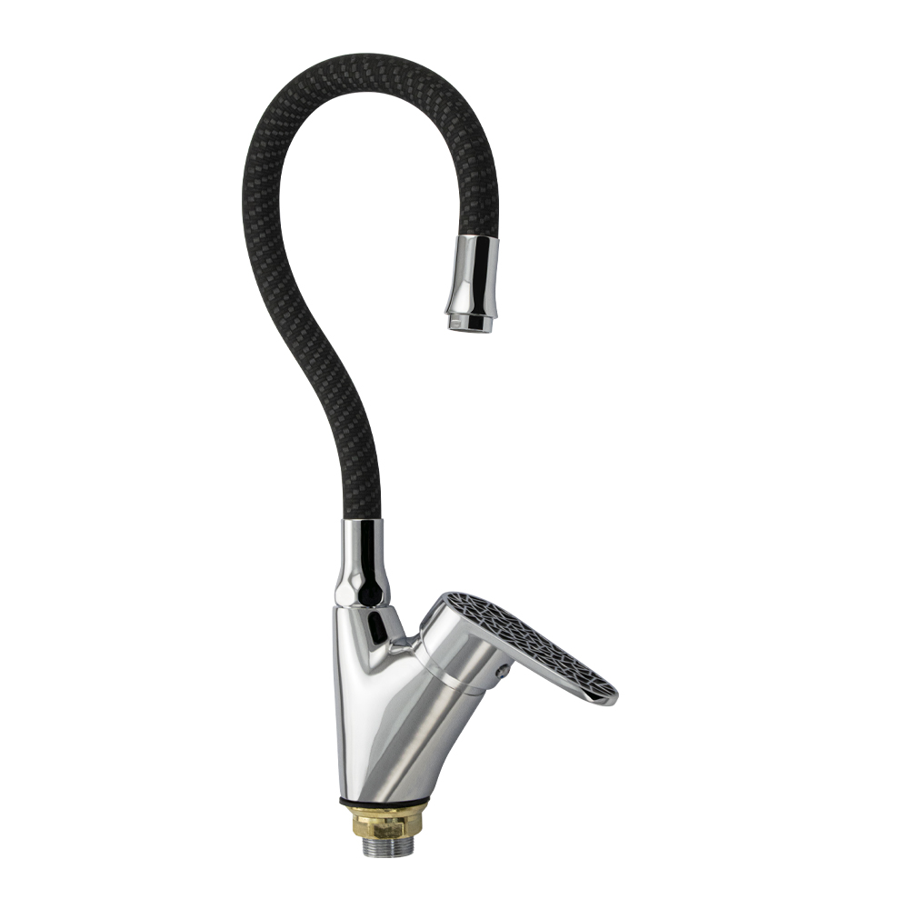 Смеситель для кухонной мойки и раковин, корпус хромированный, боковой, с высоким гибким изливом чёрного цвета, шаровый. Материал изготовления — ЦАМ (цинк-алюминий-медь) + нержавеющая сталь. Крепление резьба - гайка, картридж d = 40 мм, черная ручка с узором мозаики. Аэратор для экономии воды. Габаритные размеры: высота 400 мм, длина от 300 мм, диаметр посадочного седла 50 мм, длина резьбы 30 мм, длина подводки 500 мм. Вес - 1,600 кг, объём - 0,00550 м3. В комплекте паспорт, корпус с изливом, подводка 1/2, крепеж, набор прокладок.