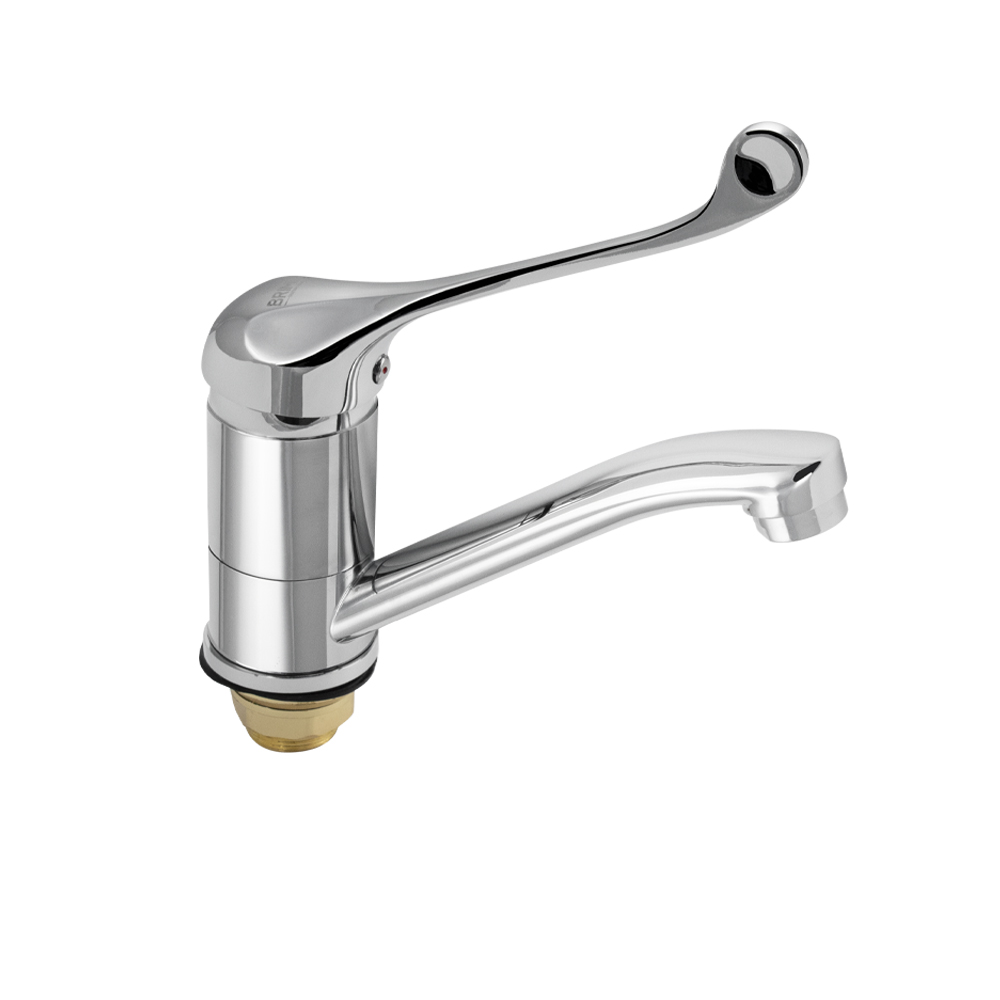 Смеситель для кухонной мойки и раковины, латунь, хромированный, с коротким, поворотным изливом, шаровый, медицинская длинная ручка. Материал изготовления — ЦАМ (цинк-алюминий-медь) + нержавеющая сталь. Крепление резьба - гайка, картридж d = 40 мм. Аэратор для экономии воды. Габаритные размеры: высота 190 мм, длина 190 мм, длина излива 150 мм, диаметр посадочного седла 50 мм, длина резьбы 30 мм, длина подводки 400 мм. Вес - 1,000 кг, объём - 0,00376 м3. Такая модель может использоваться на домашней кухне, на даче, в медицинских учреждениях и общественных местах. В комплекте паспорт, корпус, подводка 1/2, крепеж, набор прокладок.