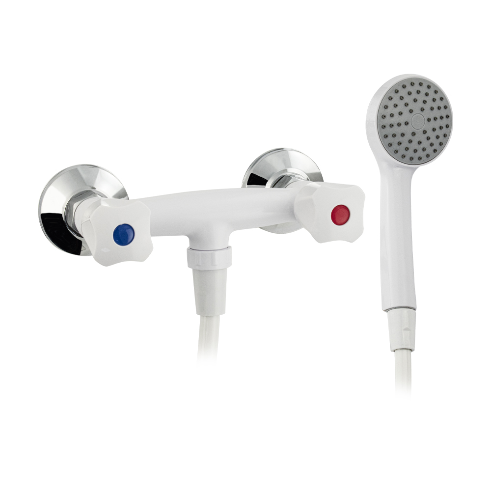 Смеситель из высокопрочного пластика АБС - белый, в ванную/душевую комнату, без излива, литой корпус, металлокерамика. Материал изготовления — пластик. Кранбуксы металлокерамика 1/2, ручки ромб поворот на 90˚. Габаритные размеры: ширина 150 мм, высота корпуса 60 мм, душевая лейка d = 80 мм, пластиковый шланг 150 см, диаметр чашки 65 мм. Вес - 0,800 кг, объём - 0,00600 м3. В комплекте паспорт, корпус, душевая лейка, шланг, кронштейн, комплект крепежа и прокладок.