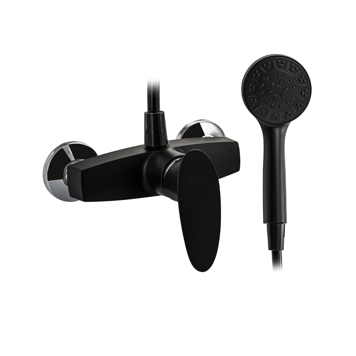 Смеситель из высокопрочного пластика АБС, ЧЕРНЫЙ в ванную / душевую комнату без излива, литой корпус, шаровый. Картридж d = 40 мм, литая ручка, хромированные чашки и эксцентрики. Габаритные размеры: ширина 150 мм, высота корпуса 120 мм, глубина 100 мм, душевая лейка d = 75 мм, пластиковый шланг 150 см. Вес - 0.88 кг, объём - 0.00442 м3. В комплекте паспорт, корпус, душевая лейка, шланг, кронштейн, комплект крепежа и прокладок.