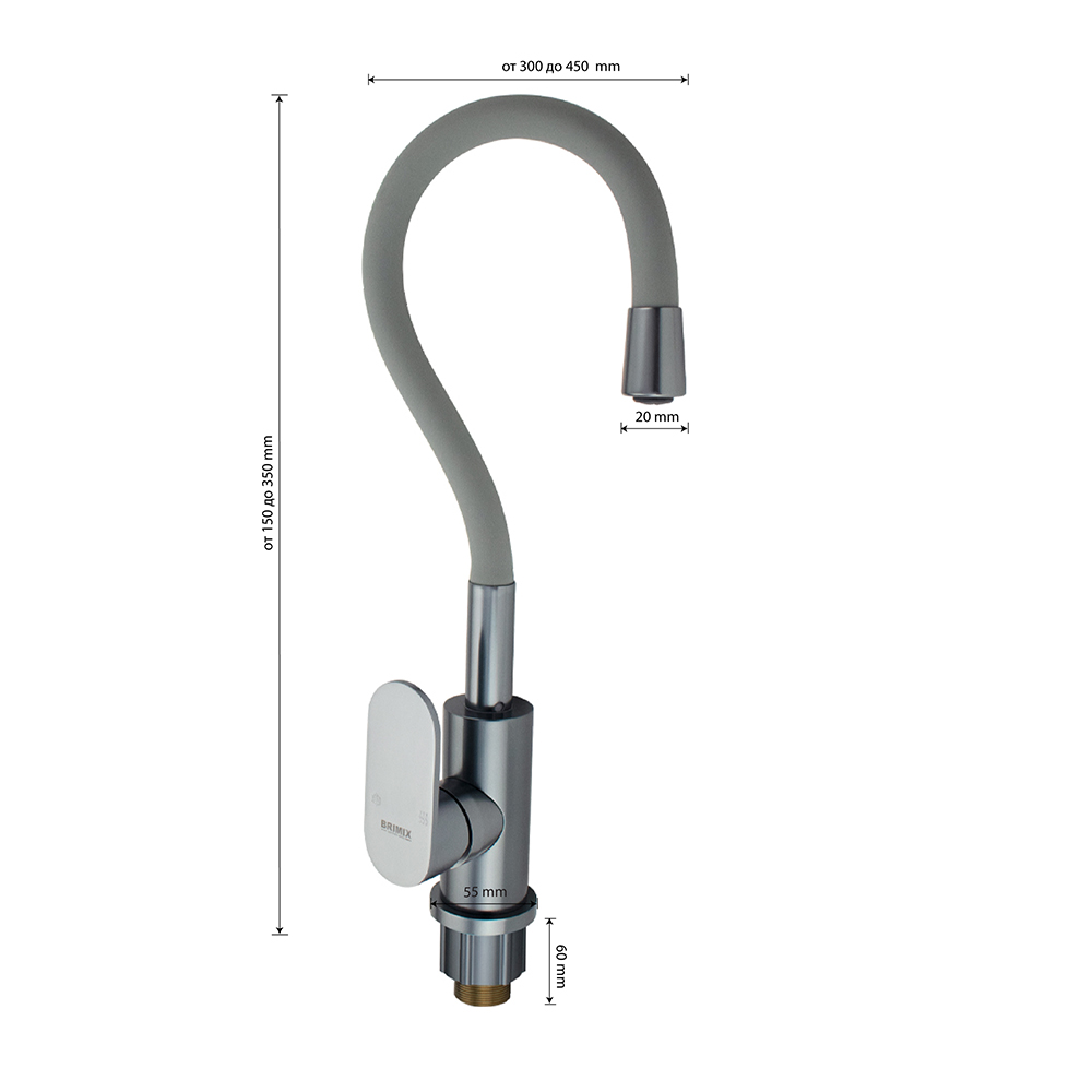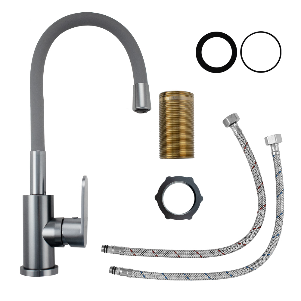 Смеситель для кухонной мойки и раковины, из авиационного алюминия, цвет титан , боковой, с гибким изливом серого цвета, шаровый. Крепление резьба - гайка, картридж d = 35 мм, литая ручка. Большой аэратор для экономии воды. Габаритные размеры: высота 150 - 350 мм, длина 300 - 450 мм, диаметр посадочного седла 55 мм, длина резьбы 60 мм, длина подводки 350 мм. Вес - 1,300 кг, объём - 0,00340 м3. В комплекте паспорт, корпус с изливом, подводка 1/2, крепеж, набор прокладок.