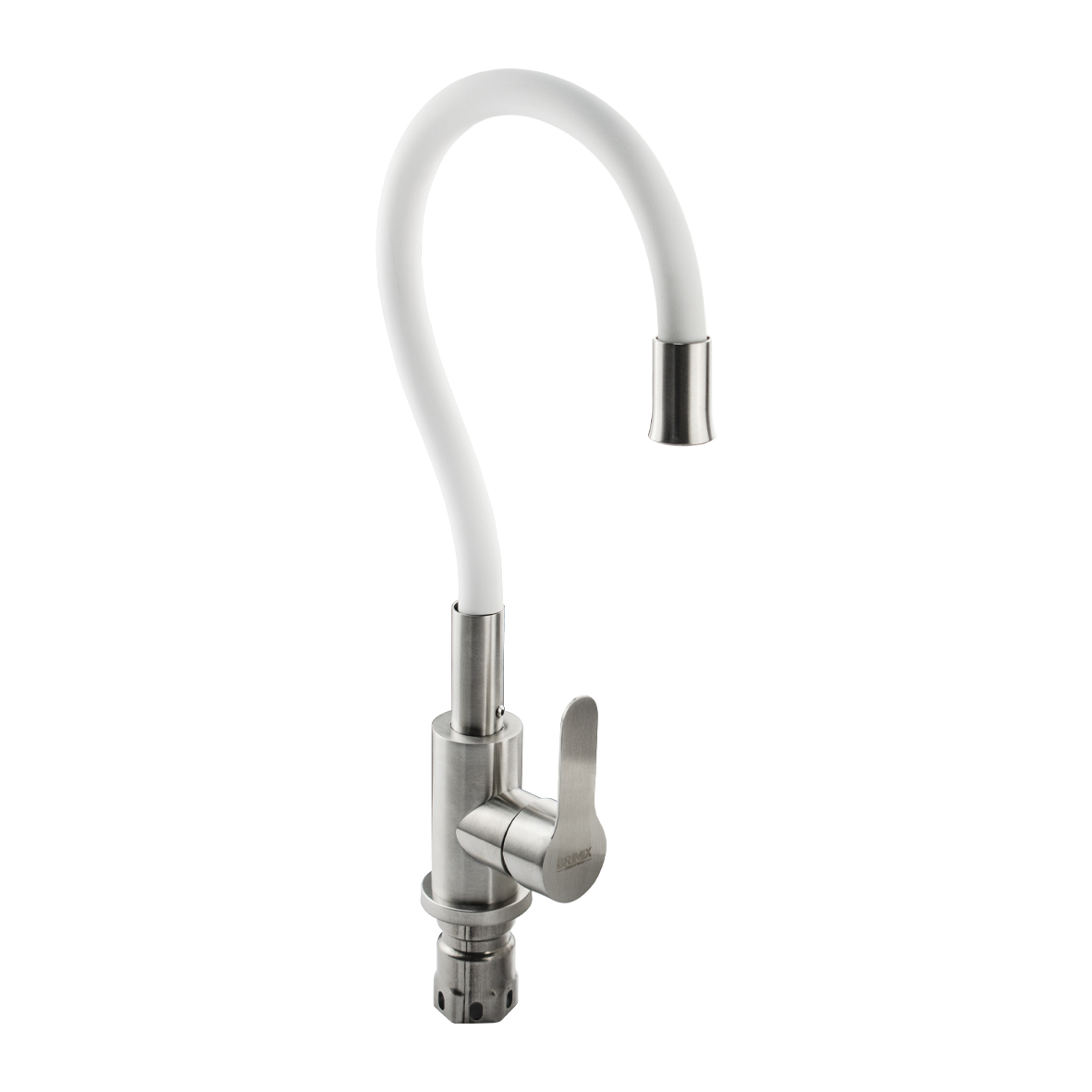Смеситель для кухонной мойки и раковин, литой матовый корпус, из нержавеющей стали марки 304, с высоким гибким изливом белого цвета на трещётке, с аэратором для экономии воды, шаровый. Крепление резьба - гайка, картридж d = 35 мм, ручка литая. Такая модель может использоваться на домашней кухне, на даче, в медицинских учреждениях и общественных местах. Габаритные размеры: высота 400 мм, длина 250 мм, диаметр посадочного седла 50 мм, длина резьбы 60 мм, длина подводки 450 мм. Вес - 1,7 кг, объём - 0,00345 м3. В комплекте паспорт, корпус с изливом, подводка 1/2, крепеж, набор прокладок.