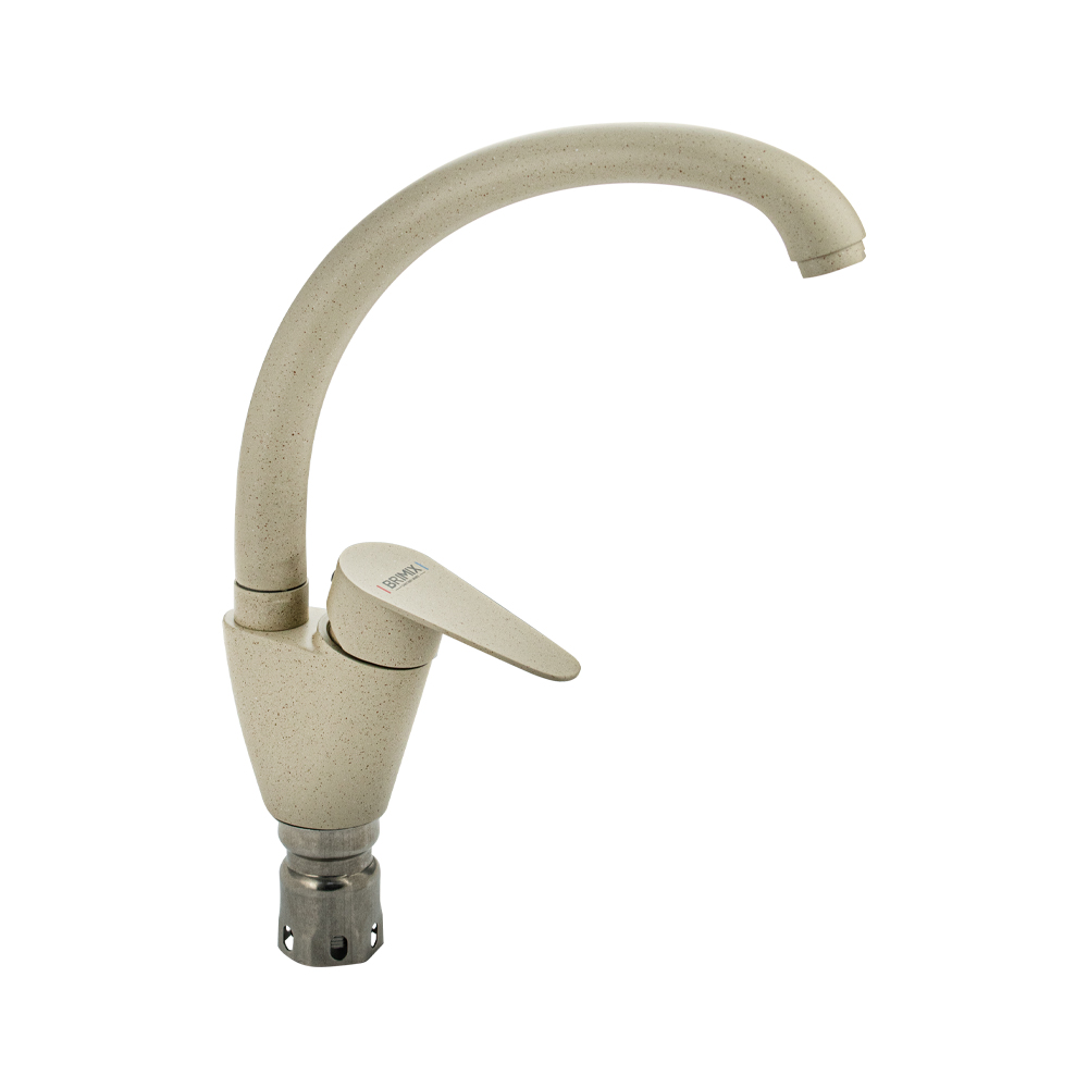 Смеситель для кухонной мойки и раковин, боковой, шаровый, корпус комбинированный, тёмно-бежевая матовая эмаль с вкраплениями и с хромом, с высоким С-образным изливом. Материал изготовления — нержавеющая сталь. Крепление резьба - гайка, картридж d = 40 мм, ручка с прорезью. Аэратор для экономии воды. Габаритные размеры: высота 280 мм, длина 250 мм, диаметр посадочного седла 50 мм, длина резьбы 55 мм, длина подводки 500 мм. Вес - 1,110 кг, объём - 0,00420 м3. В комплекте паспорт, корпус с изливом, подводка 1/2, крепеж, набор прокладок.