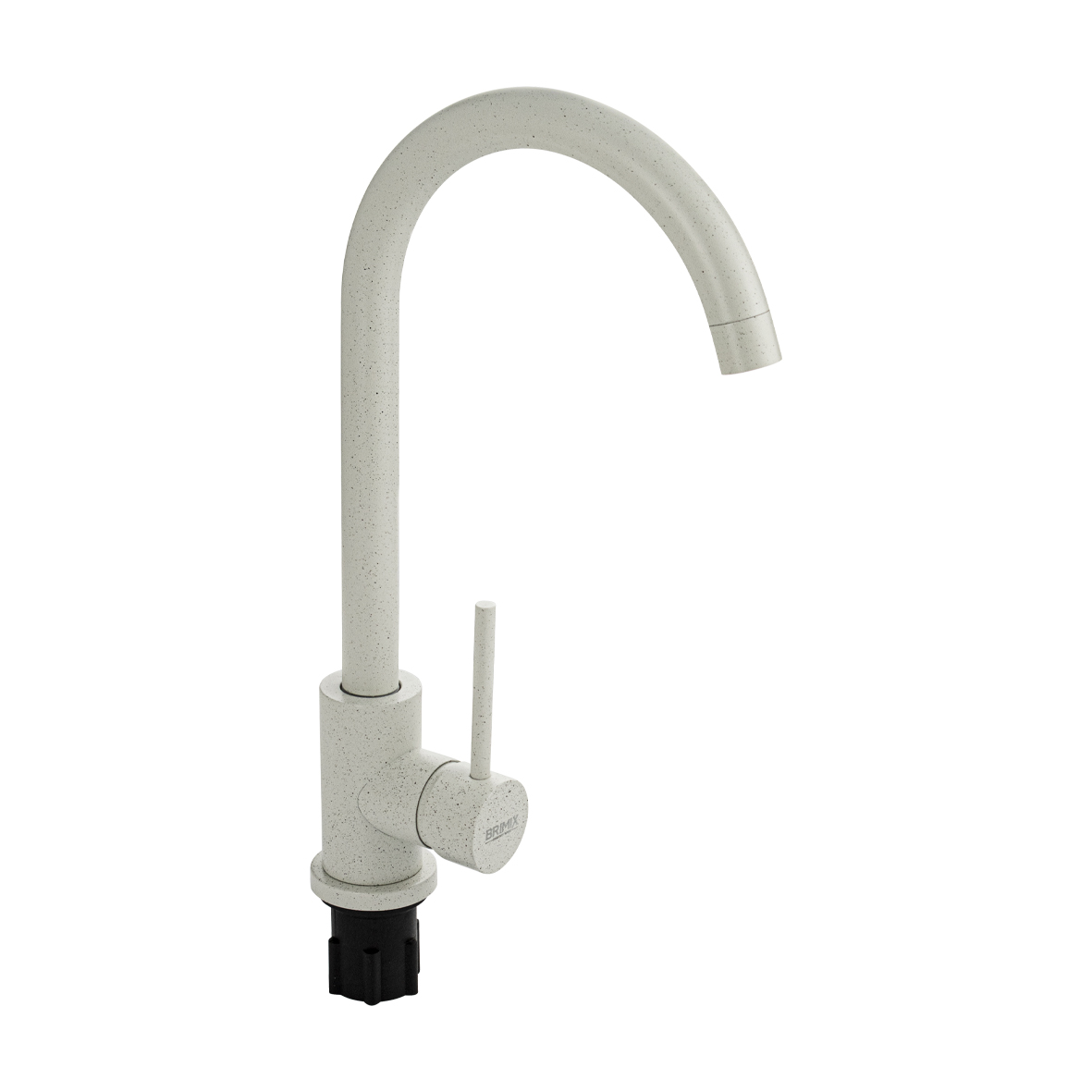 Смеситель для кухонной мойки и раковин, литой матовый корпус, из нержавеющей стали марки 304, с высоким С-образным изливом, шаровый. Цвет белая эмаль с вкраплениями. Крепление резьба - гайка, картридж d = 35 мм, ручка литая. Аэратор для экономии воды. Такая модель может использоваться на домашней кухне, на даче, в медицинских учреждениях и общественных местах. Габаритные размеры: высота 330 мм, длина 220 мм, диаметр посадочного седла 40 мм, длина резьбы 450 мм, длина подводки 450 мм. Вес - 1.38 кг, объём - 0.0055 м3. В комплекте паспорт, корпус с изливом, подводка 1/2, крепеж, набор прокладок.