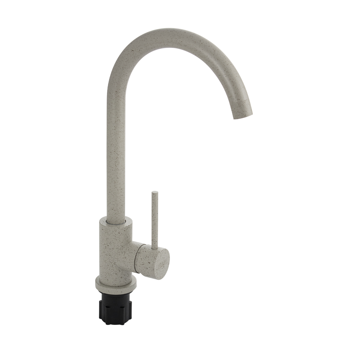 Смеситель для кухонной мойки и раковин, литой матовый корпус, из нержавеющей стали марки 304, с высоким С-образным изливом, шаровый. Цвет тёмно-бежевая эмаль с вкраплениями. Крепление резьба - гайка, картридж d = 35 мм, ручка литая. Аэратор для экономии воды. Такая модель может использоваться на домашней кухне, на даче, в медицинских учреждениях и общественных местах. Габаритные размеры: высота 330 мм, длина 220 мм, диаметр посадочного седла 40 мм, длина резьбы 45 мм, длина подводки 450 мм. Вес - 1.38 кг, объём - 0.0055 м3. В комплекте паспорт, корпус с изливом, подводка 1/2, крепеж, набор прокладок.