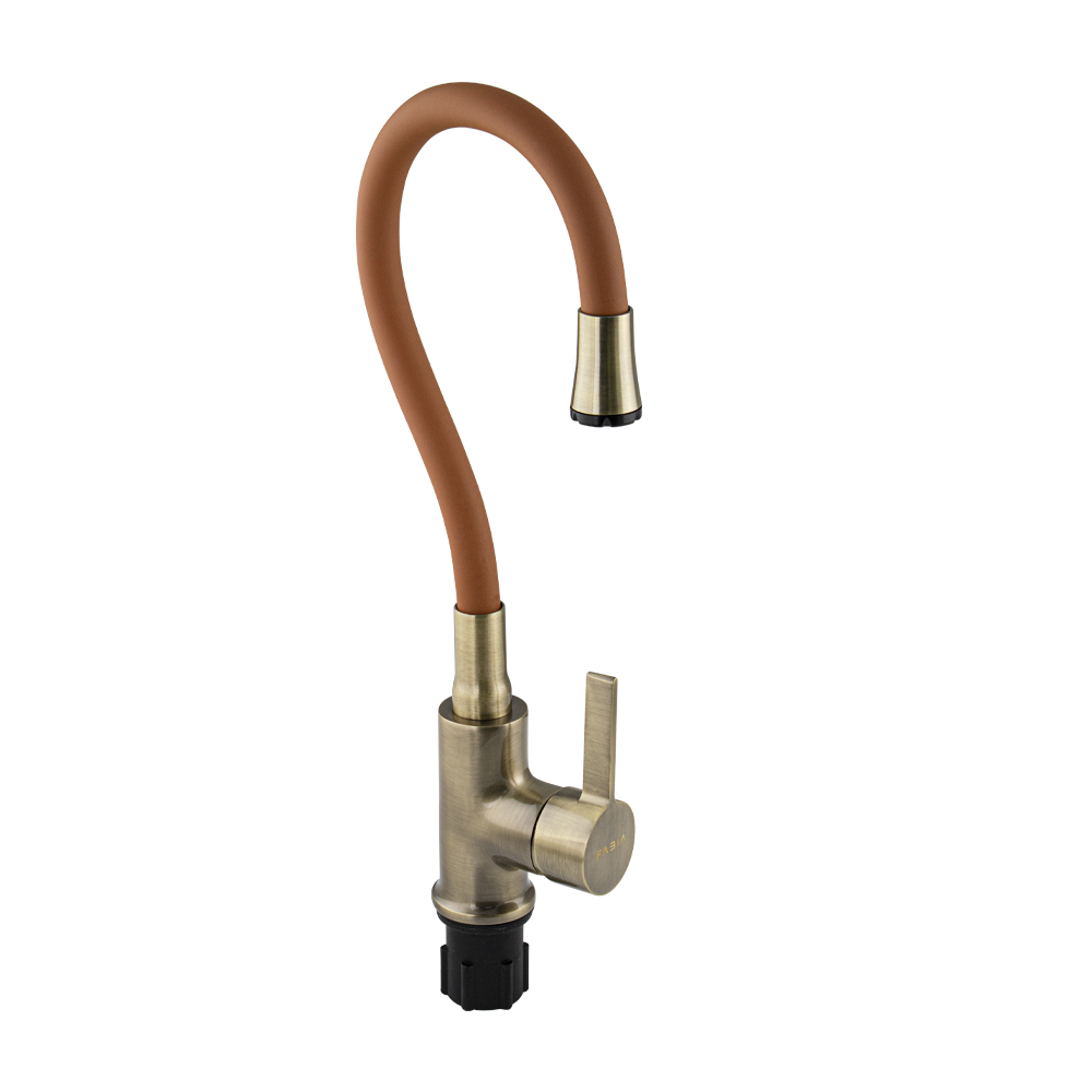 Смеситель для кухонной мойки и раковин, литой корпус бронзового цвета, с высоким гибким изливом коричневого цвета, с аэратором для экономии воды, шаровый. Материал изготовления — ЦАМ (цинк-алюминий-медь) + нержавеющая сталь. Крепление резьба - гайка, картридж d = 35 мм, ручка литая. Такая модель может использоваться на домашней кухне, на даче, в медицинских учреждениях и общественных местах. Габаритные размеры: высота 340-400 мм, длина 50-250 мм, диаметр посадочного седла 45 мм, длина резьбы 50 мм, длина подводки 400 мм. Вес - 1,350 кг, объём - 0,00403 м3. В комплекте паспорт, корпус с изливом, подводка 1/16, крепеж, набор прокладок.