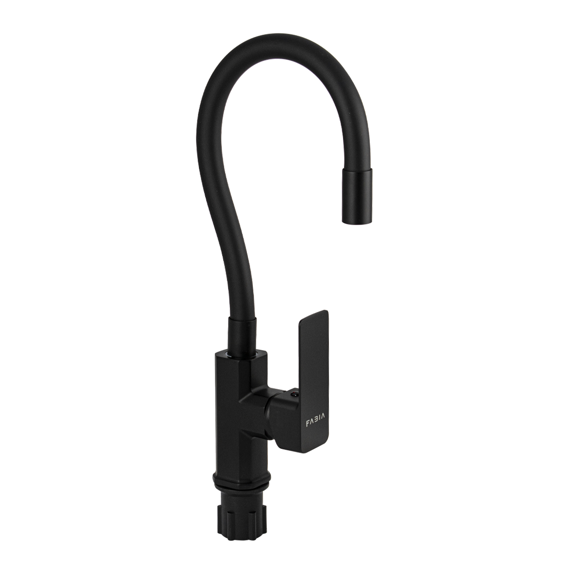 Смеситель для кухонной мойки и раковин, черный, боковой, шаровый d = мм, массивный корпус с гибким изливом чёрного цвета, с аэратором для экономии воды. Материал изготовления — ЦАМ (цинк-алюминий-медь). Крепление резьба - гайка, литая ручка. Вес - 1.5 кг, объём - 0.00585 м3. В комплекте корпус с изливом, паспорт, подводка 1/2, крепёж. Габаритные размеры коробки: ширина 200 мм, высота 400 мм, высота резьбы 45 мм, диаметр посадочного седла 45 мм.