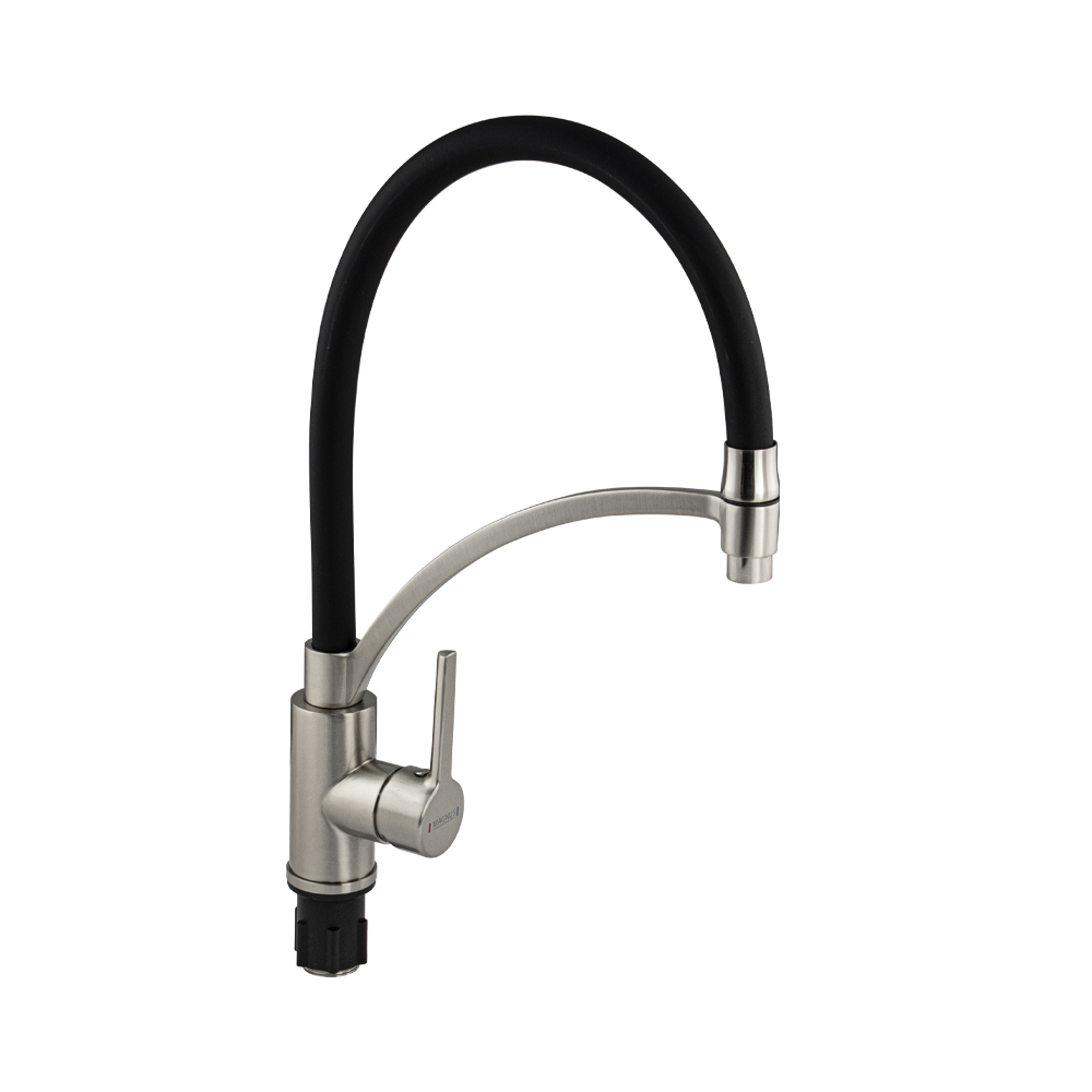 Смеситель для кухонной мойки и раковин, литой матовый корпус, из нержавеющей стали марка 304, с высоким гибким изливом чёрного цвета с фиксацией, с аэратором для экономии воды, шаровый, Крепление резьба - гайка, картридж d = 35 мм, ручка литая. Такая модель может использоваться на домашней кухне, на даче, в медицинских учреждениях и общественных местах. Габаритные размеры: высота 410 мм, длина 260 мм, диаметр посадочного седла 45 мм, длина резьбы 45 мм, длина подводки 450 мм. Вес - 2,2 кг, объём - 0,00761 м3. В комплекте паспорт, корпус с изливом, подводка 1/2, крепеж, набор прокладок