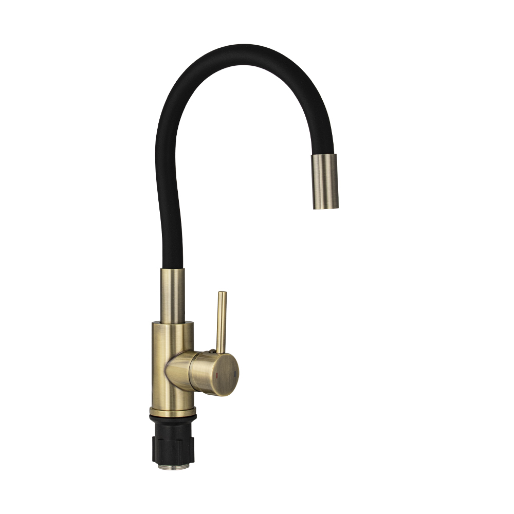 Смеситель для кухонной мойки и раковин, литой корпус, из нержавеющей стали марки 304, с высоким гибким изливом чёрного цвета, с аэратором для экономии воды, шаровый, цвет бронза. Крепление резьба - гайка, картридж d = 35 мм, ручка литая. Такая модель может использоваться на домашней кухне, на даче, в медицинских учреждениях и общественных местах. Габаритные размеры: высота до 350 мм, длина до 250 мм, диаметр посадочного седла 45 мм, длина резьбы 55 мм, длина подводки 450 мм. Вес - 1,8 кг, объём - 0,0042 м3. В комплекте паспорт, корпус с изливом, подводка 1/2, крепеж, набор прокладок.