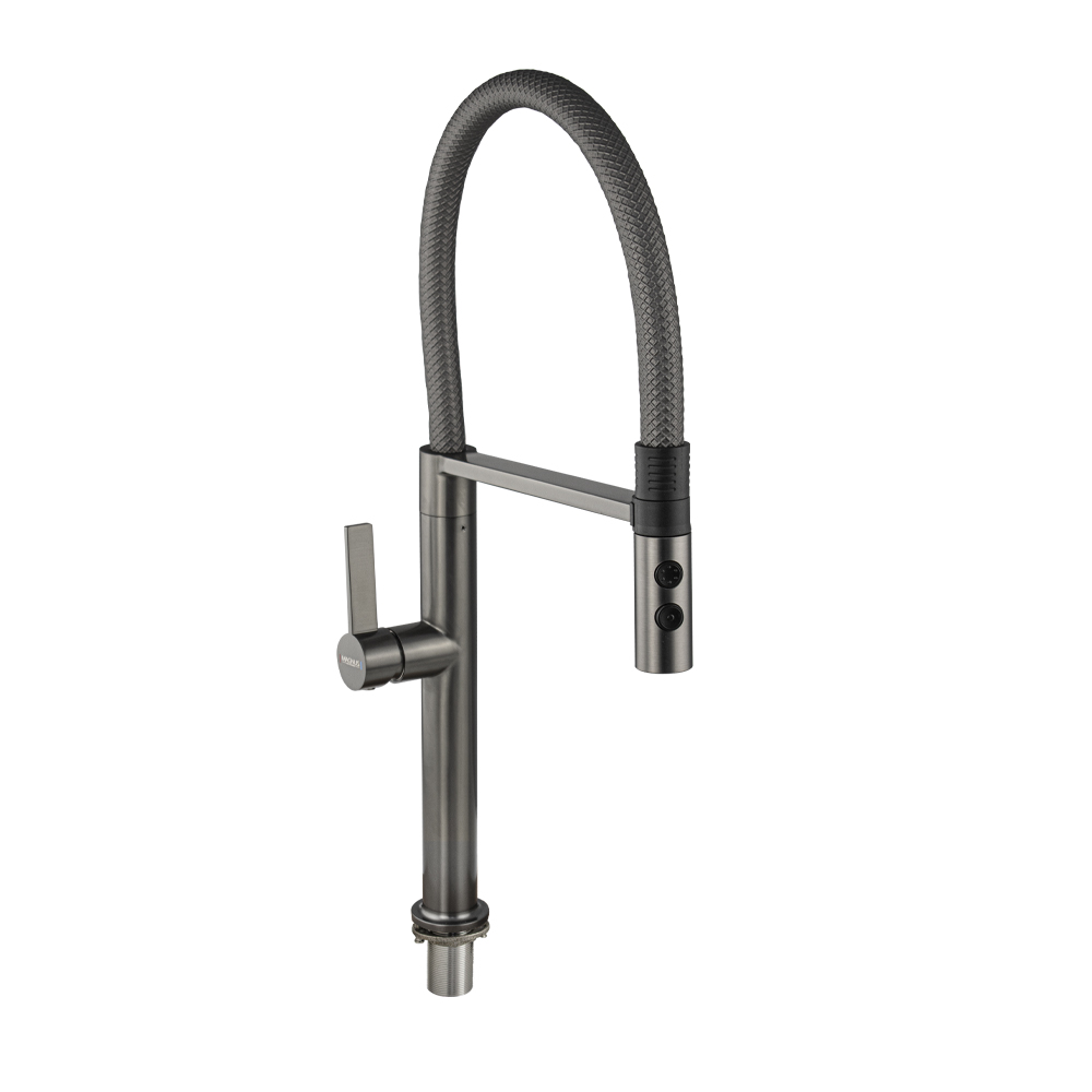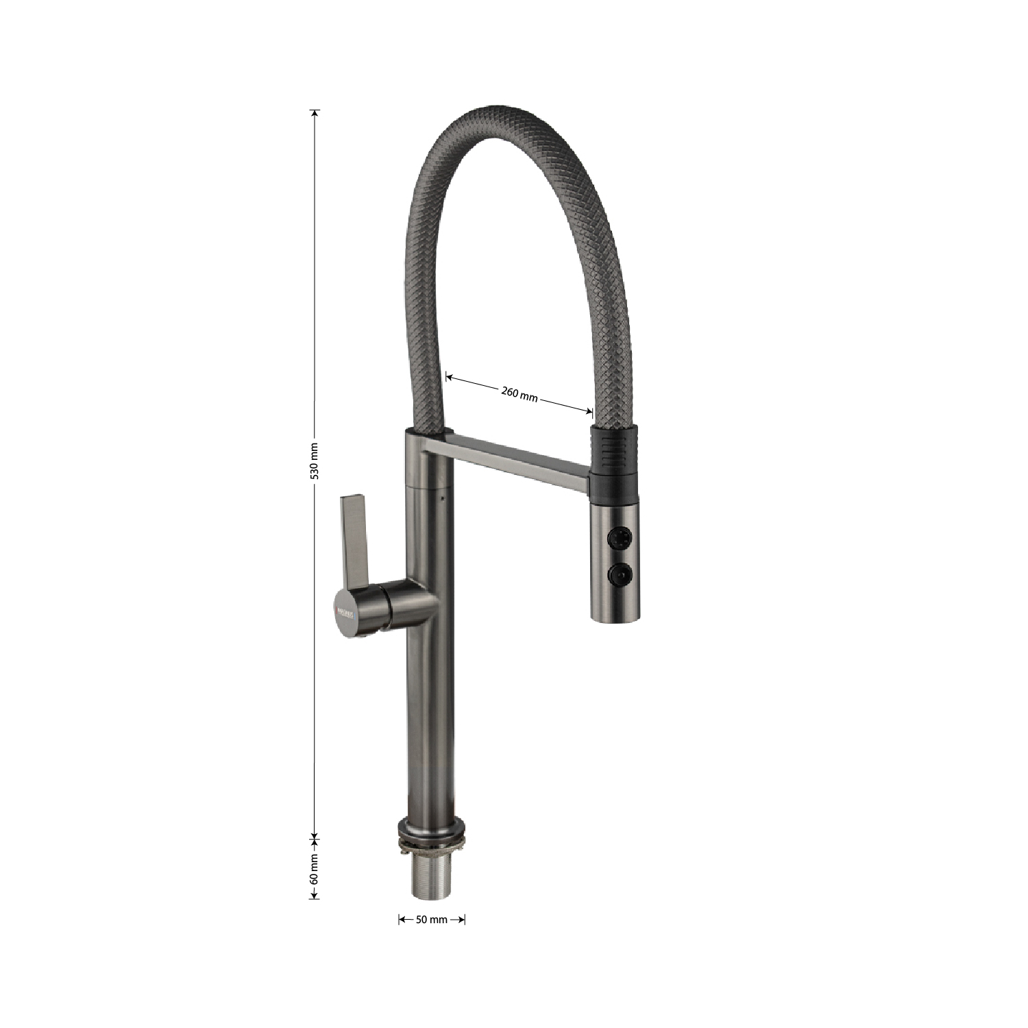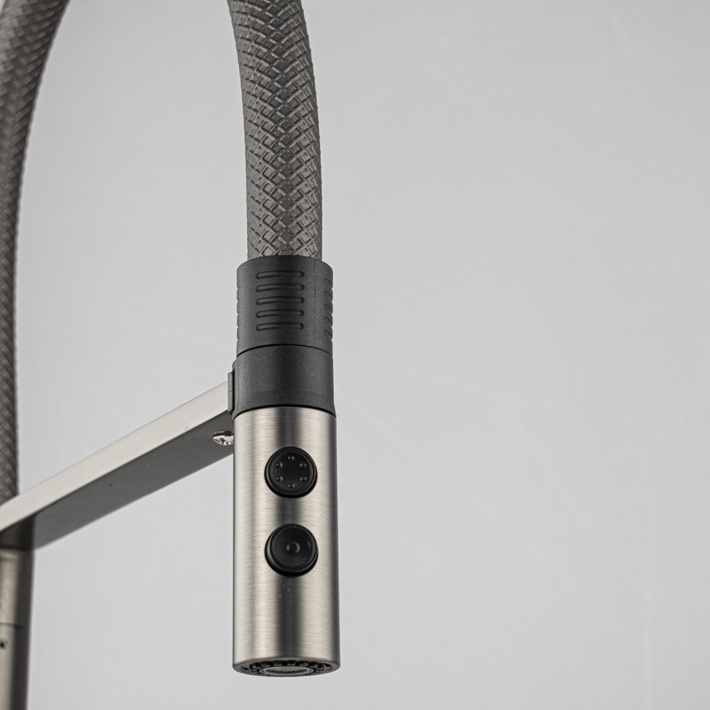Смеситель для кухонной мойки с гибким серым рельефным изливом с магнитной фиксацией, двухрежимный аэратор, литой корпус цвета графит, из нержавеющей стали марка SUS 304. Крепление резьба - гайка, картридж d = мм, ручка шток. Аэратор для экономии воды. Такая модель может использоваться на домашней кухне, на даче, в медицинских учреждениях и общественных местах. Габаритные размеры: высота 530 мм, длина 260 мм, диаметр посадочного седла 50 мм, длина резьбы 60 мм, длина подводки 500 мм. Вес - 2.28 кг, объём - 0.01092 м3. В комплекте паспорт, корпус с изливом, подводка 1/2, крепеж, набор прокладок.