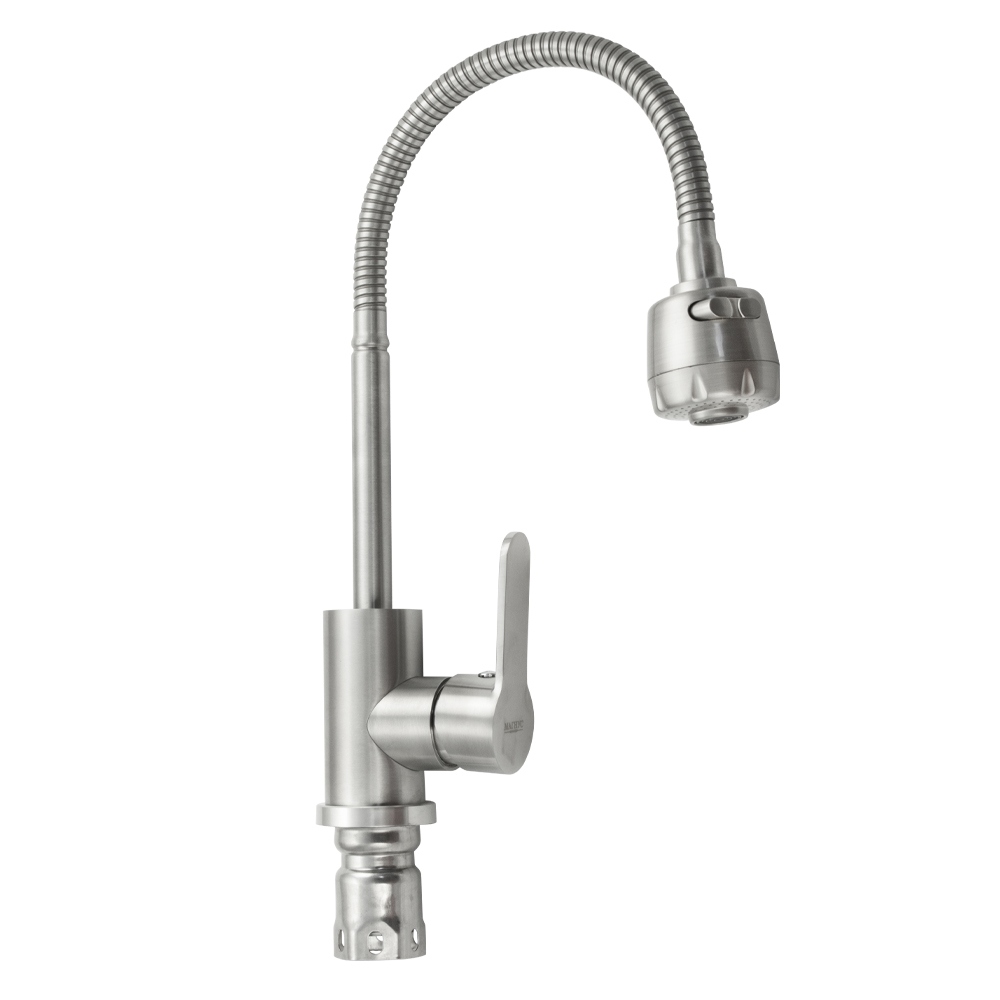 Смеситель для кухонной мойки и раковин, литой матовый корпус, из нержавеющей стали марки 304, с высоким гибким изливом, с большим двухрежимным аэратором для экономии воды, шаровый. Крепление резьба - гайка, картридж d = 35 мм, ручка литая. Такая модель может использоваться на домашней кухне, на даче, в медицинских учреждениях и общественных местах. Габаритные размеры: высота 290 - 380 мм, длина 200 - 300 мм, диаметр посадочного седла 55 мм, длина резьбы 60 мм, длина подводки 450 мм. Вес - 1,700 кг, объём - 0,00635 м3. В комплекте паспорт, корпус с изливом, подводка 1/2, крепеж, набор прокладок.