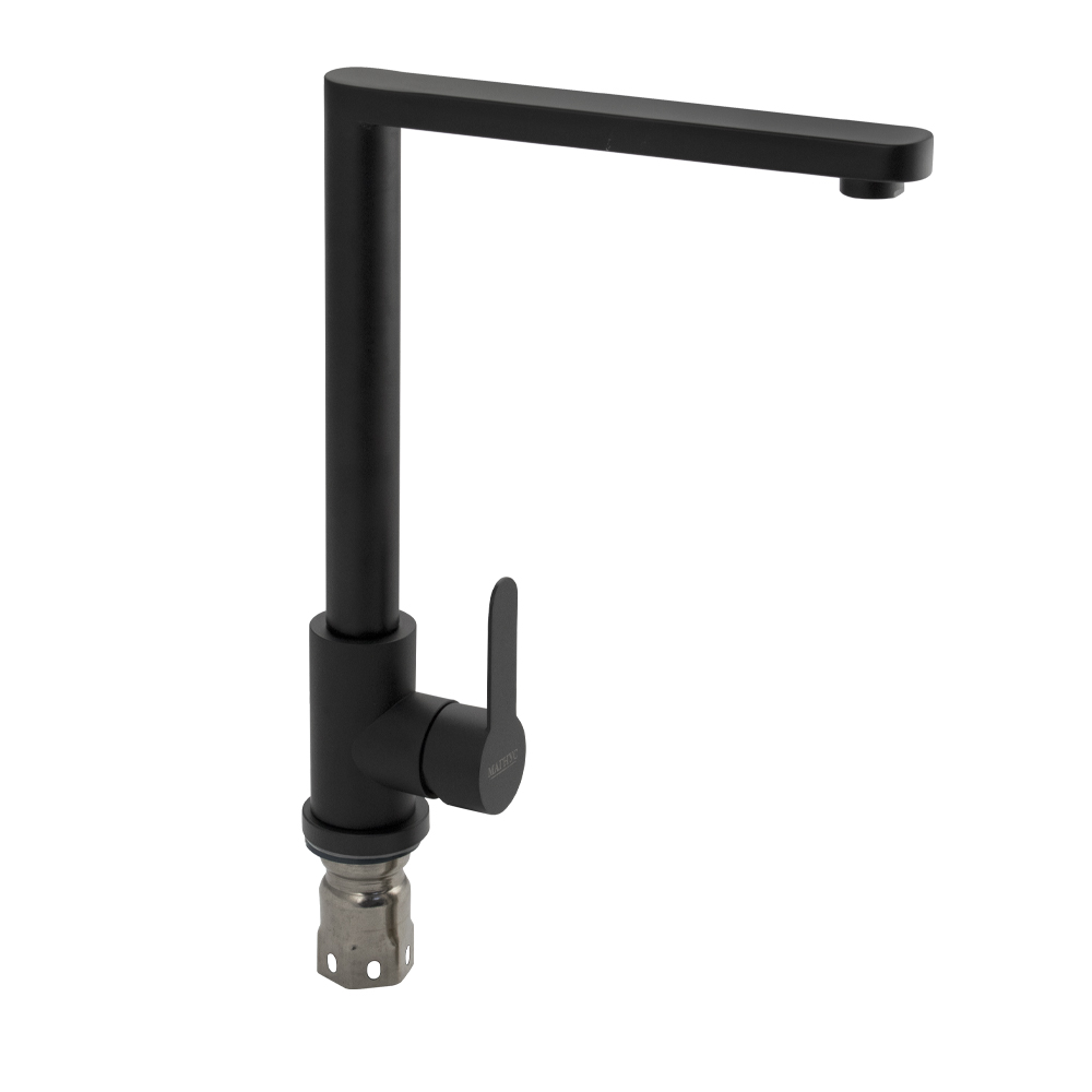 Смеситель для кухонной мойки и раковин, цвет ЧЁРНЫЙ, литой корпус, из нержавеющей стали марки 304, с высоким литым Г-образным изливом, шаровый. Крепление резьба - гайка, картридж d = 35 мм, ручка литая. Аэратор для экономии воды. Такая модель может использоваться на домашней кухне, на даче, в медицинских учреждениях и общественных местах. Габаритные размеры: высота 310 мм, длина 240 мм, диаметр посадочного седла 50 мм, длина резьбы 60 мм, длина подводки 450 мм. Вес - 1,600 кг, объём - 0,00647 м3. В комплекте паспорт, корпус с изливом, подводка 1/2, крепеж, набор прокладок.