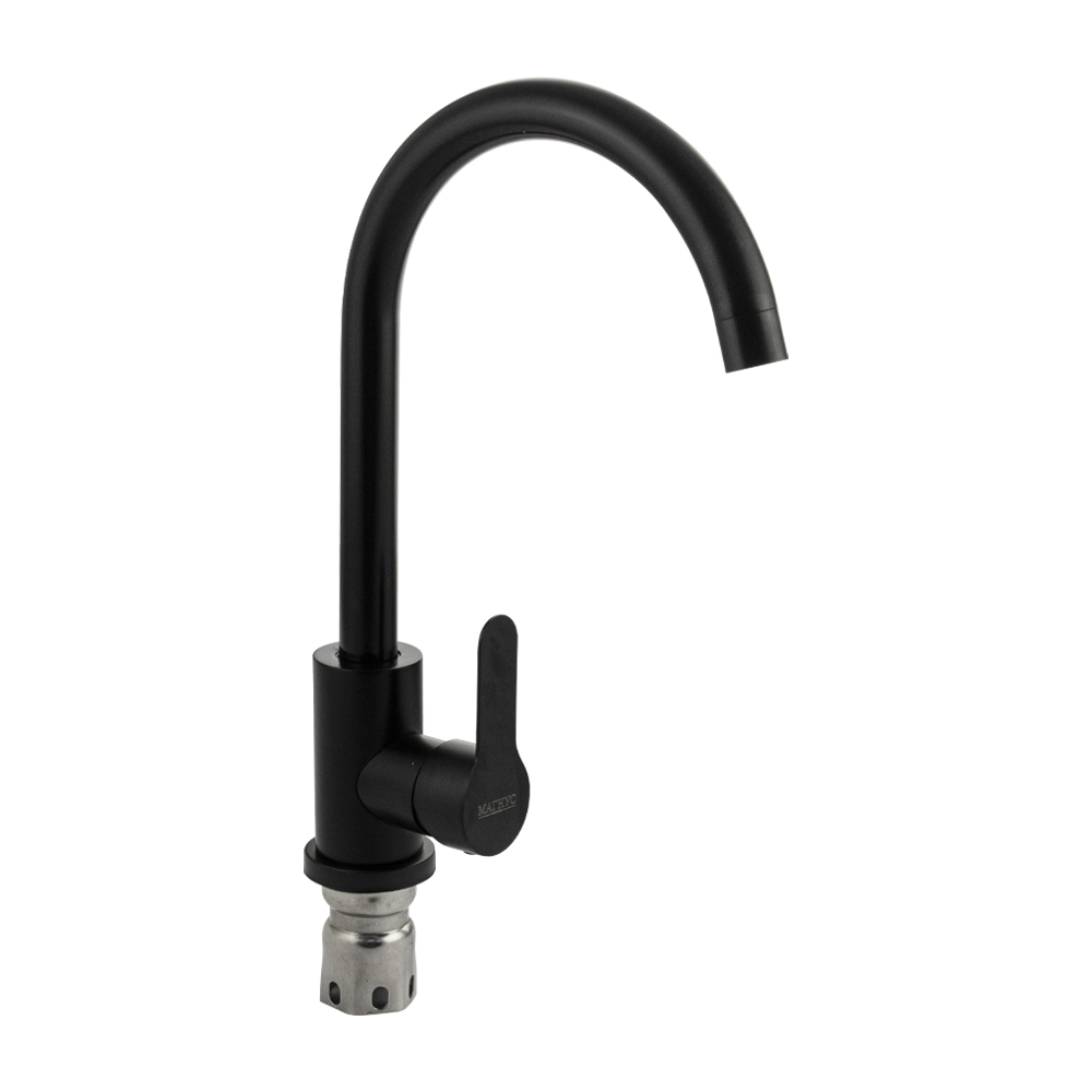 Смеситель для кухонной мойки и раковин, литой матовый корпус чёрного цвета, из нержавеющей стали марка 304, с высоким С-образным изливом, шаровый. Крепление резьба - гайка, картридж d = 35 мм, ручка литая. Аэратор для экономии воды. Такая модель может использоваться на домашней кухне, на даче, в медицинских учреждениях и общественных местах. Габаритные размеры: высота 320 мм, длина 210 мм, диаметр посадочного седла 55 мм, длина резьбы 55 мм, длина подводки 450 мм. Вес - 1,300 кг, объём - 0,00490 м3. В комплекте паспорт, корпус с изливом, подводка 1/2, крепеж, набор прокладок