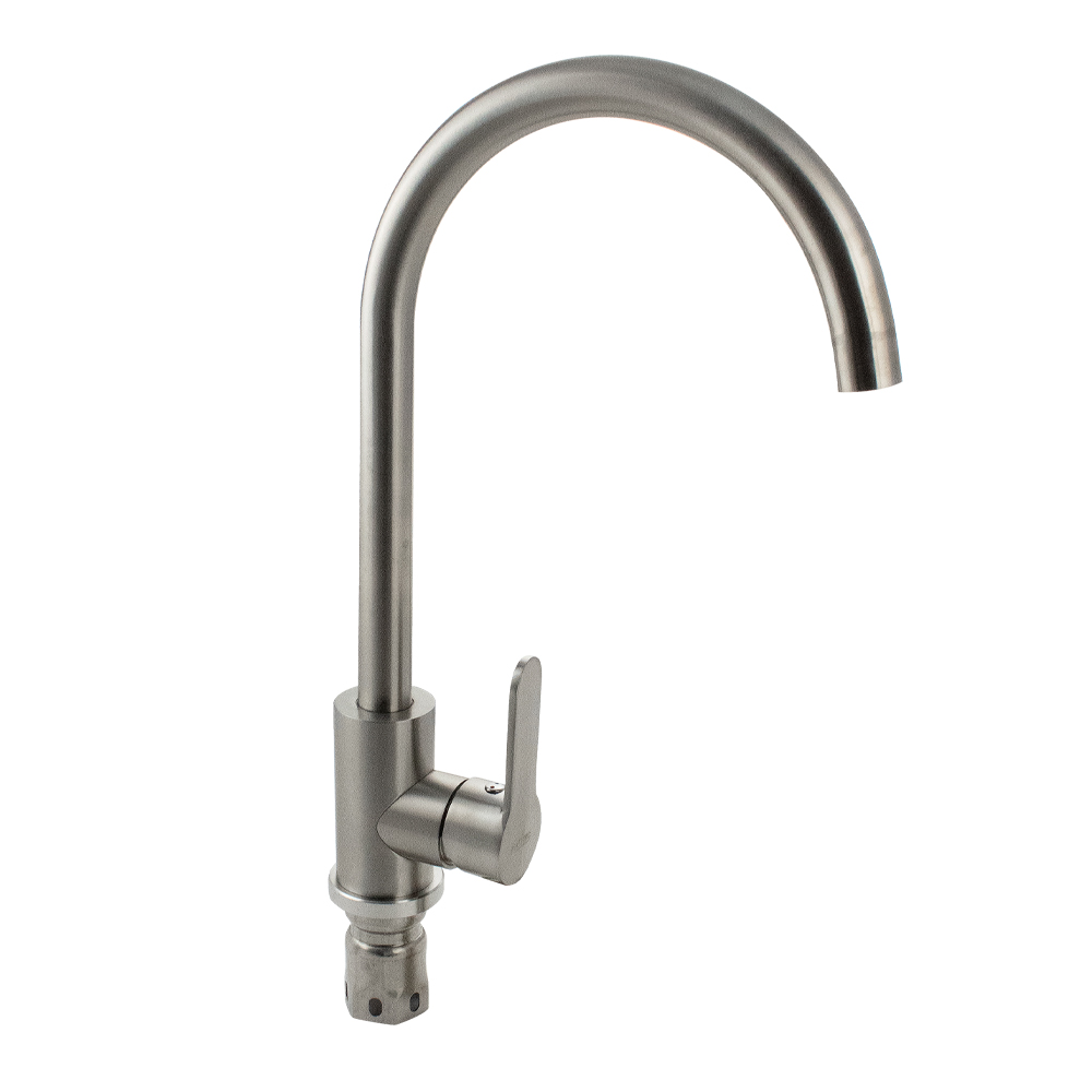 Смеситель для кухонной мойки и раковин, литой матовый корпус, из нержавеющей стали марки 304, с высоким С-образным изливом, шаровый. Крепление резьба - гайка, картридж d = 35 мм, ручка литая. Аэратор для экономии воды. Такая модель может использоваться на домашней кухне, на даче, в медицинских учреждениях и общественных местах. Габаритные размеры: высота 350 мм, длина 210 мм, диаметр посадочного седла 53 мм, длина резьбы 60 мм, длина подводки 500 мм. Вес - 1,500 кг, объём - 0,00635 м3. В комплекте паспорт, корпус с изливом, подводка 1/2, крепеж, набор прокладок.