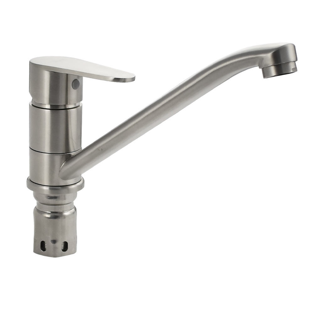 Смеситель для кухонной мойки и раковин, литой матовый корпус с длинным, поворотным изливом 25 см, из нержавеющей стали марки 304, шаровый. Крепление резьба - гайка, картридж d = 40 мм, ручка литая. Аэратор для экономии воды. Такая модель может использоваться на домашней кухне, на даче, в медицинских учреждениях и общественных местах. Габаритные размеры: высота 110 мм, длина 250 мм, длина излива 220 мм, диаметр посадочного седла 50 мм, длина резьбы 60 мм, длина подводки 450 мм. Вес - 1,200 кг, объём - 0,00319 м3. В комплекте паспорт, корпус с изливом, подводка 1/2, крепеж, набор прокладок.