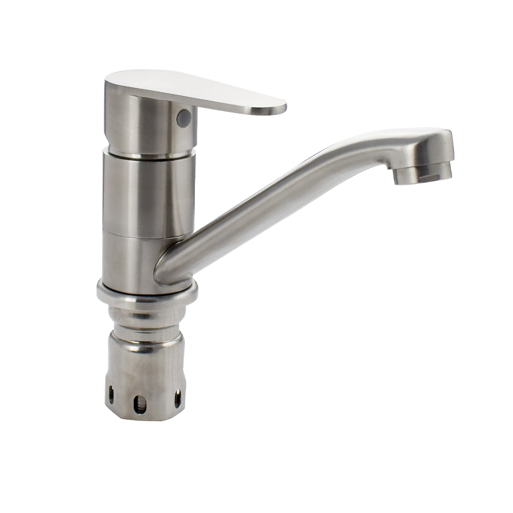 Смеситель для кухонной мойки и раковин, литой матовый корпус с коротким, поворотным изливом 15 см, из нержавеющей стали марки 304, шаровый. Крепление резьба - гайка, картридж d = 40 мм, ручка литая. Аэратор для экономии воды. Такая модель может использоваться на домашней кухне, на даче, в медицинских учреждениях и общественных местах. Габаритные размеры: высота 110 мм, длина 185 мм, длина излива 150 мм, диаметр посадочного седла 50 мм, длина резьбы 60 мм, длина подводки 450 мм. Вес - 1,100 кг, объём - 0,00237 м3. В комплекте паспорт, корпус с изливом, подводка 1/2, крепеж, набор прокладок.
