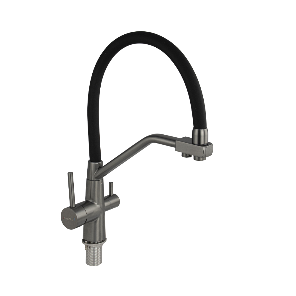 Смеситель для кухонной мойки и раковин с двойным выпуском воды для фильтра, литой матовый корпус, из нержавеющей стали марка 304, с высоким С-образным гибким изливом чёрного цвета с фиксацией на жёстком изливе, шаровый. Крепление резьба - гайка, картридж d = 40 мм, ручка шток. Аэратор для экономии воды. Такая модель может использоваться на домашней кухне, на даче, в медицинских учреждениях и общественных местах. Габаритные размеры: высота 410 мм, длина 280 мм, диаметр посадочного седла 45 мм, длина резьбы 55 мм, длина подводки 500 мм. Вес - 2,400 кг, объём - 0,00690 м3. В комплекте паспорт, корпус с изливом, подводка 1/2, крепеж, набор прокладок.