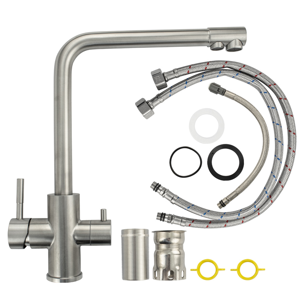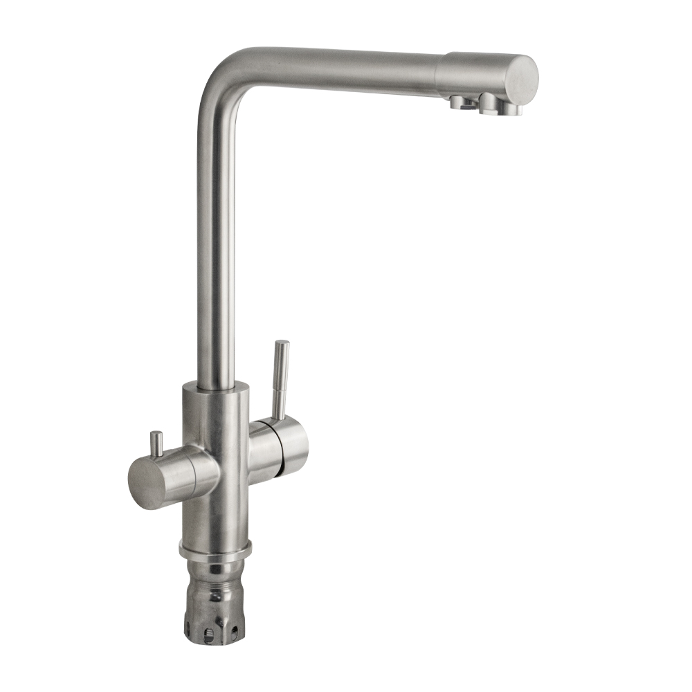 Смеситель для кухонной мойки и раковин с двойным выпуском воды для фильтра, литой матовый корпус, из нержавеющей стали марка 304, с высоким Г - образным изливом, шаровый. Крепление резьба - гайка, картридж d = 40 мм, ручка шток. Аэратор для экономии воды. Такая модель может использоваться на домашней кухне, на даче, в медицинских учреждениях и общественных местах. Габаритные размеры: высота 350 мм, длина 300 мм, диаметр посадочного седла 50 мм, длина резьбы 60 мм, длина подводки 500 мм. Вес - 2,400 кг, объём - 0,00900 м3. В комплекте паспорт, корпус с изливом, подводка 1/2, крепеж, набор прокладок