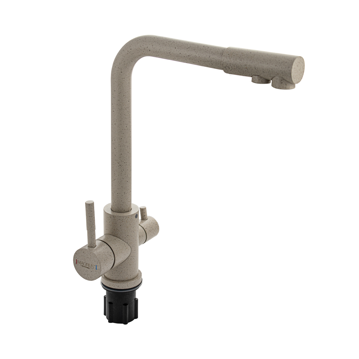 Смеситель для кухонной мойки и раковин, с двойным выпуском воды для фильтра, литой матовый корпус, из нержавеющей стали марки 304 темнокоричневый, с высоким Г - образным изливом, шаровый. Крепление резьба - гайка, картридж d = 40 мм, ручка шток. Аэратор для экономии воды. Такая модель может использоваться на домашней кухне, на даче, в медицинских учреждениях и общественных местах. Габаритные размеры: высота 300 мм, длина 230 мм, диаметр посадочного седла 40 мм, длина резьбы 45 мм, длина подводки 500 мм. Вес - 1.9 кг, объём - 0.009 м3. В комплекте паспорт, корпус с изливом, подводка 1/2, крепеж, набор прокладок