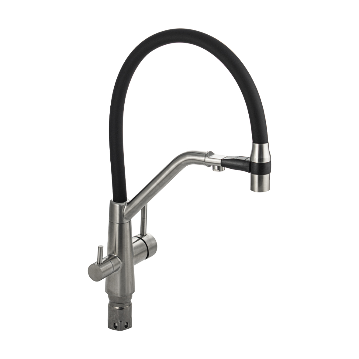 Смеситель для кухонной мойки и раковин с двойным выпуском воды для фильтра, литой матовый корпус, из нержавеющей стали марка 304, с высоким С-образным гибким изливом чёрного цвета с магнитной фиксацией на жёстком изливе, шаровый. Крепление резьба - гайка, картридж d = 40 мм, ручка шток. Аэратор для экономии воды. Такая модель может использоваться на домашней кухне, на даче, в медицинских учреждениях и общественных местах. Габаритные размеры: высота 425 мм, длина 260 мм, диаметр посадочного седла 45 мм, длина резьбы 55 мм, длина подводки 500 мм. Вес - 2,570 кг, объём - 0,013 м3. В комплекте паспорт, корпус с изливом, подводка 1/2, крепеж, набор прокладок.