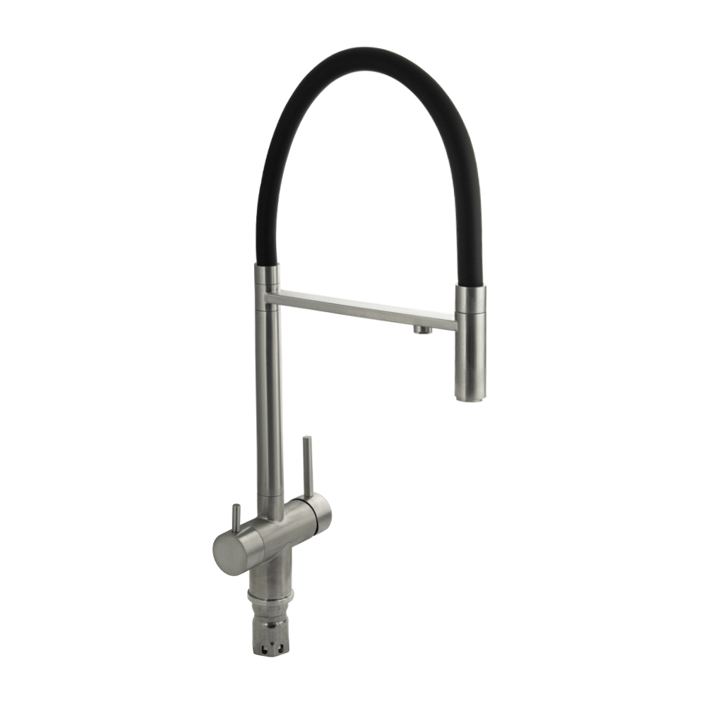 Смеситель для кухонной мойки и раковин с двойным выпуском воды для фильтра, литой матовый корпус, из нержавеющей стали марка 304, с высоким С-образным гибким изливом чёрного цвета, шаровый. Крепление резьба - гайка, картридж d = 40 мм, ручка шток. Аэратор для экономии воды. Такая модель может использоваться на домашней кухне, на даче, в медицинских учреждениях и общественных местах. Габаритные размеры: высота 560 мм, длина 260 мм, диаметр посадочного седла 50 мм, длина резьбы 60 мм, длина подводки 500 мм. Вес - 2,700 кг, объём - 0,01300 м3. В комплекте паспорт, корпус с изливом, подводка 1/2, крепеж, набор прокладок