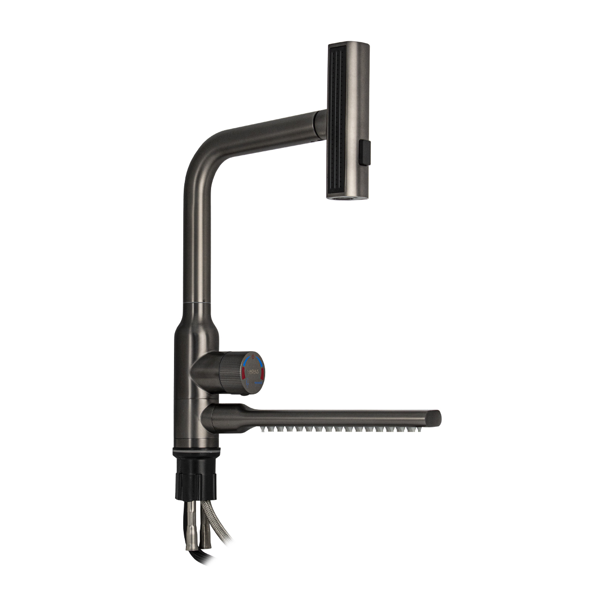 Смеситель для кухонной мойки и раковин, вытяжной излив - лейка с переключением режимов подачи воды и с горизонтальной каскадной лейкой, литой матовый корпус, из нержавеющей стали, цвет графит, шаровый. Крепление резьба - гайка, картридж d = 35 мм, ручка литая. Аэратор для экономии воды. Такая модель может использоваться на домашней кухне, на даче, в медицинских учреждениях и общественных местах. Габаритные размеры: высота 370 мм, длина 230 мм, посадочное седло 45 мм, длина резьбы 50 мм. Вес - 2,1 кг, объём - 0,01 м3. В комплекте паспорт, корпус с изливом, подводка 1/2, крепеж, набор прокладок.