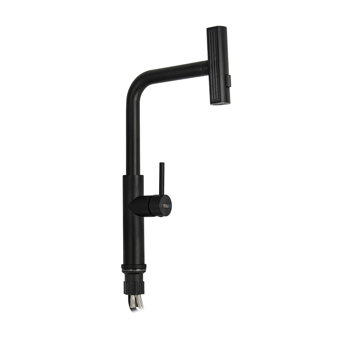 Смеситель для кухонной мойки и раковин, вытяжной излив - лейка с переключением режимов подачи воды, литой матовый корпус, из нержавеющей стали, цвет черный, шаровый. Крепление резьба - гайка, картридж d = 35 мм, ручка литая. Аэратор для экономии воды. Такая модель может использоваться на домашней кухне, на даче, в медицинских учреждениях и общественных местах. Габаритные размеры: высота 450 мм, длина 230 мм, посадочное седло 45 мм, длина резьбы 50 мм. Вес - 1,85 кг, объём - 0,01 м3. В комплекте паспорт, корпус с изливом, подводка 1/2, крепеж, набор прокладок.