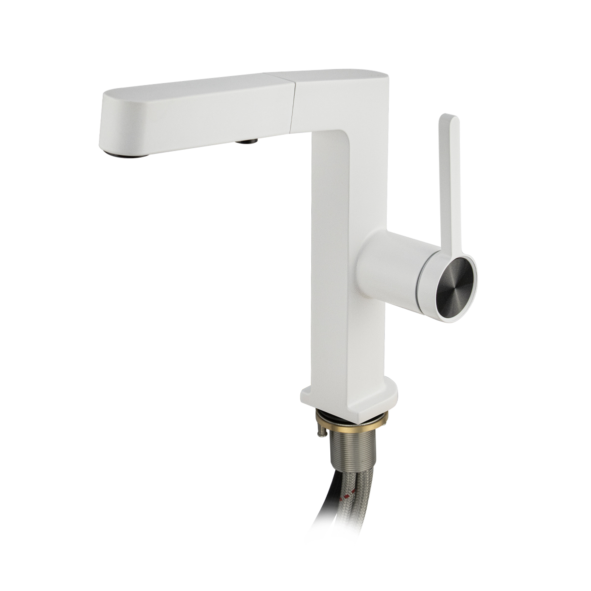 Смеситель для кухонной мойки и раковин, вытяжной излив - лейка с переключением режимов подачи воды, литой корпус белого цвета, из латуни, шаровый. Крепление резьба - гайка, картридж d = 35 мм, ручка литая. Аэратор для экономии воды. Такая модель может использоваться на домашней кухне, на даче, в медицинских учреждениях и общественных местах. Габаритные размеры: высота 220 мм, длина 230 мм, посадочное седло 50*50 мм. Вес - 2,450 кг, объём - 0,01633 м3. В комплекте паспорт, корпус с изливом, подводка 1/2, крепеж, набор прокладок