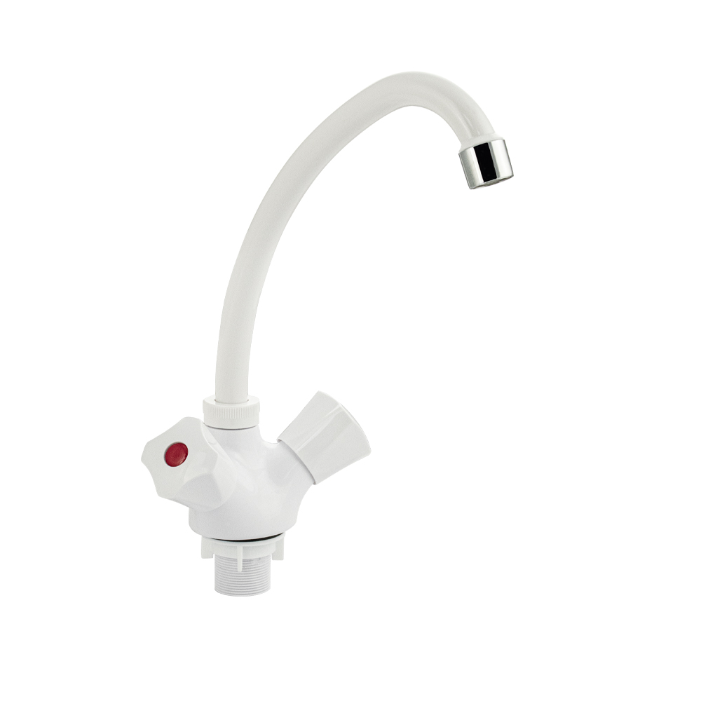 Смеситель из высокопрочного пластика АБС - белый, для кухонной мойки и раковин, с аэратором для экономии воды. Материал изготовления — пластик. Кранбуксы металлокерамика 1/2, ручки ромб поворот на 90˚, крепление резьба - гайка. Габаритные размеры: высота 280 мм, длина 210 мм, диаметр посадочного седла 60 мм, длина резьбы 35 мм, длина подводки 400 мм. Вес - 0,500 кг, объём - 0,00350 м3. В комплекте корпус с изливом, паспорт, подводка, крепёж. Габаритные размеры упаковки: ширина 260 мм, высота 76 мм, глубина 150 мм.