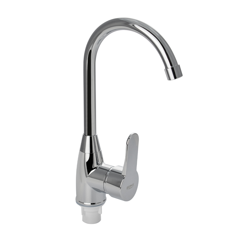 Смеситель для кухонной мойки и раковин, из высокопрочного пластика АБС, хромированный, боковой, с высоким С-образным изливом, шаровый. Крепление резьба - гайка, картридж d = 40 мм, литая ручка. Хромированный аэратор для экономии воды. Габаритные размеры: высота 330 мм, длина 210 мм, диаметр посадочного седла 50 мм, длина резьбы 40 мм, длина подводки 400 мм. Вес - 0,600 кг, объём - 0,00491 м3. В комплекте паспорт, корпус с изливом, пластиковая подводка с латунными штуцерами 1/2, крепеж, набор прокладок.
