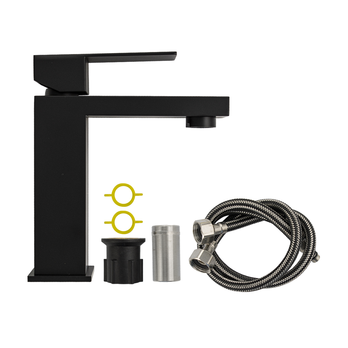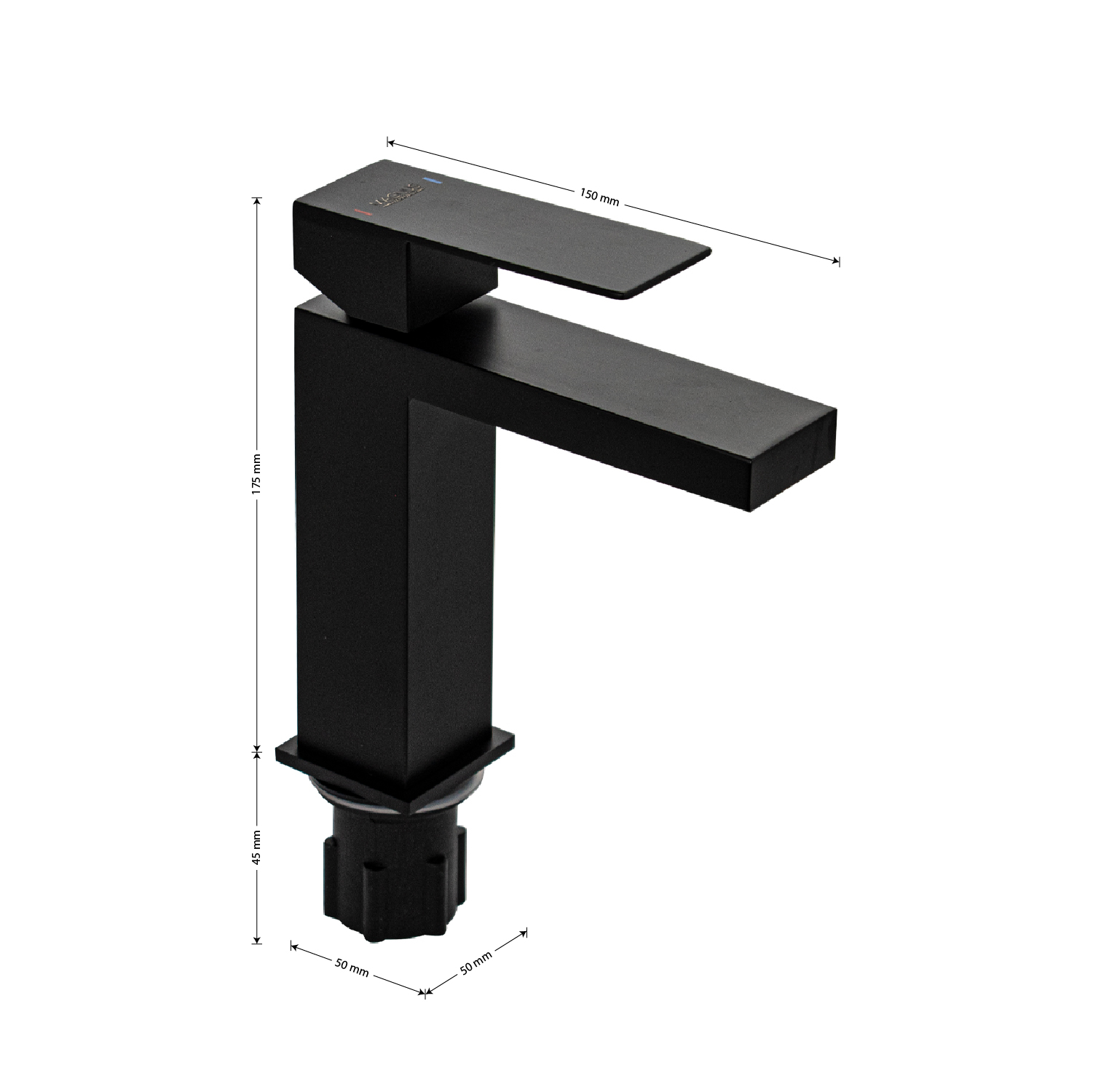 Смеситель для раковины, черный квадратный корпус, из нержавеющей стали марки 304, с длинным изливом, литая ручка, шаровый. Крепление резьба - гайка, картридж d = 35 мм. Аэратор для экономии воды. Такая модель может использоваться на домашней кухне, на даче, в медицинских учреждениях и общественных местах. Габаритные размеры: высота 175 мм, длина 150 мм, посадочноу седло 50*50 мм, длина резьбы 45 мм, длина подводки 450 мм. Вес - 1.05 кг, объём - 0.00248 м3. В комплекте паспорт, корпус, подводка 1/2, крепеж, набор прокладок.