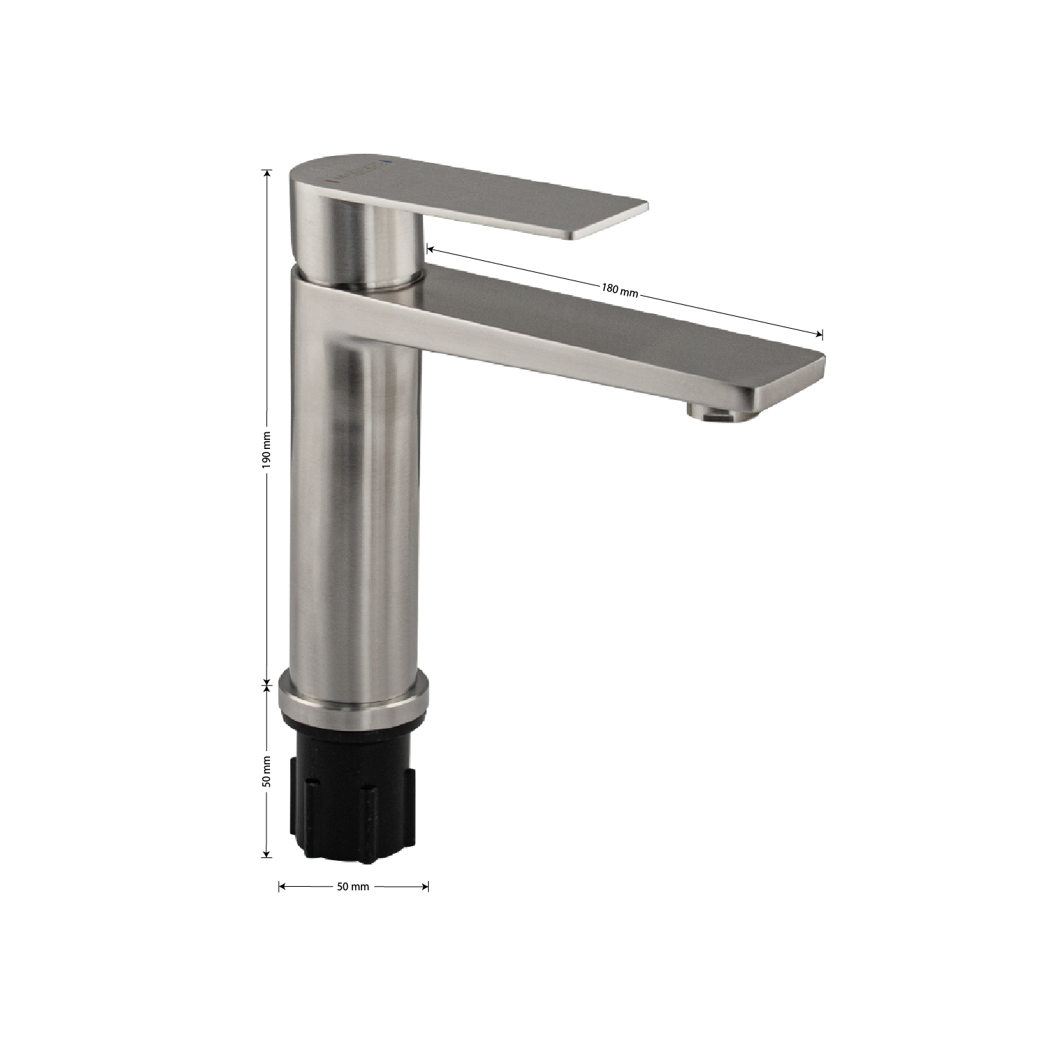 Смеситель для раковины, матовый литой корпус, из нержавеющей стали марки SUS 304, с коротким литым изливом, литая ручка, шаровый. Крепление резьба - гайка, картридж d = мм. Аэратор для экономии воды. Такая модель может использоваться на домашней кухне, на даче, в медицинских учреждениях и общественных местах. Габаритные размеры: высота 190 мм, длина 180 мм, диаметр посадочного седла 50 мм, длина резьбы 50 мм, длина подводки 500 мм. Вес - кг, объём - м3. В комплекте паспорт, корпус, подводка 1/2, крепеж, набор прокладок.