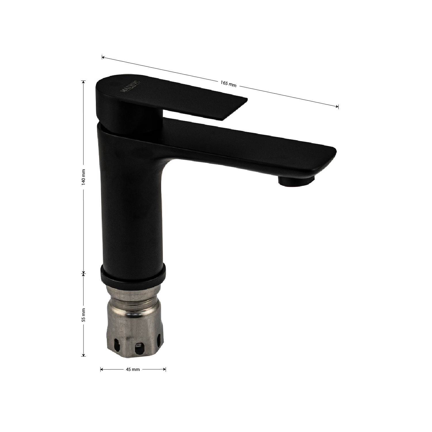 Смеситель для раковины, черный литой корпус, из нержавеющей стали марки 304, с коротким литым изливом, литая ручка, шаровый. Крепление резьба - гайка, картридж d = 40 мм. Аэратор для экономии воды. Такая модель может использоваться на домашней кухне, на даче, в медицинских учреждениях и общественных местах. Габаритные размеры: высота 140 мм, длина 165 мм, длина излива 120 мм, диаметр посадочного седла 45 мм, длина резьбы 55 мм, длина подводки 450 мм. Вес - 1,260 кг, объём - 0,0034 м3. В комплекте паспорт, корпус, подводка 1/2, крепеж, набор прокладок.