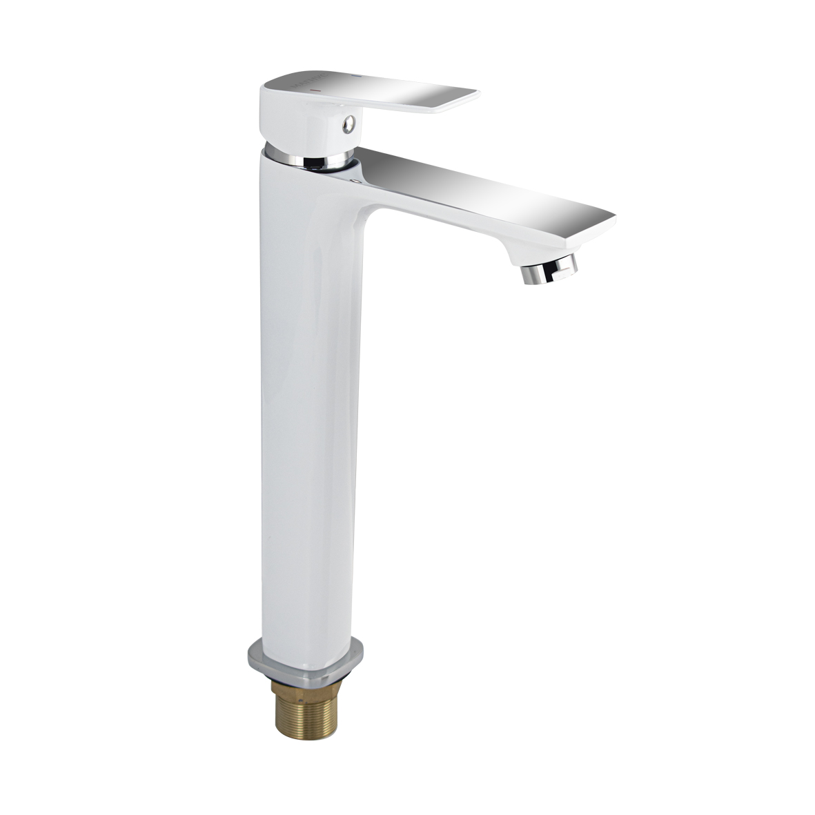Смеситель для раковины, литой корпус, цвет белый с хромированной вставкой, с прямым плоским изливом, ручка литая, шаровый. Крепление резьба - гайка, картридж d = 35 мм. Аэратор для экономии воды. Такая модель может использоваться на домашней кухне, на даче, в медицинских учреждениях и общественных местах. Габаритные размеры: высота 300 мм, длина 170 мм, посадочное седло 45 мм, длина резьбы 35 мм, длина подводки 500 мм. Вес - 1,100 кг, объём - 0,0058 м3. В комплекте паспорт, корпус, подводка 1/2, крепеж, набор прокладок.