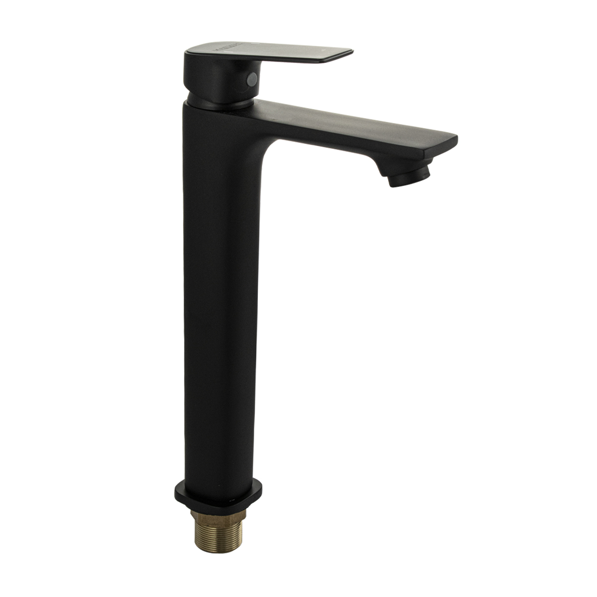Смеситель для раковины, высокий литой корпус, цвет чёрный, с прямым плоским изливом, ручка литая, шаровый. Крепление резьба - гайка, картридж d = 35 мм. Аэратор для экономии воды. Такая модель может использоваться на домашней кухне, на даче, в медицинских учреждениях и общественных местах. Габаритные размеры: высота 305 мм, длина 170 мм, посадочное седло 45*45 мм, длина резьбы 35 мм, длина подводки 500 мм. Вес - 1,500 кг, объём - 0,00532 м3. В комплекте паспорт, корпус, подводка 1/2, крепеж, набор прокладок.