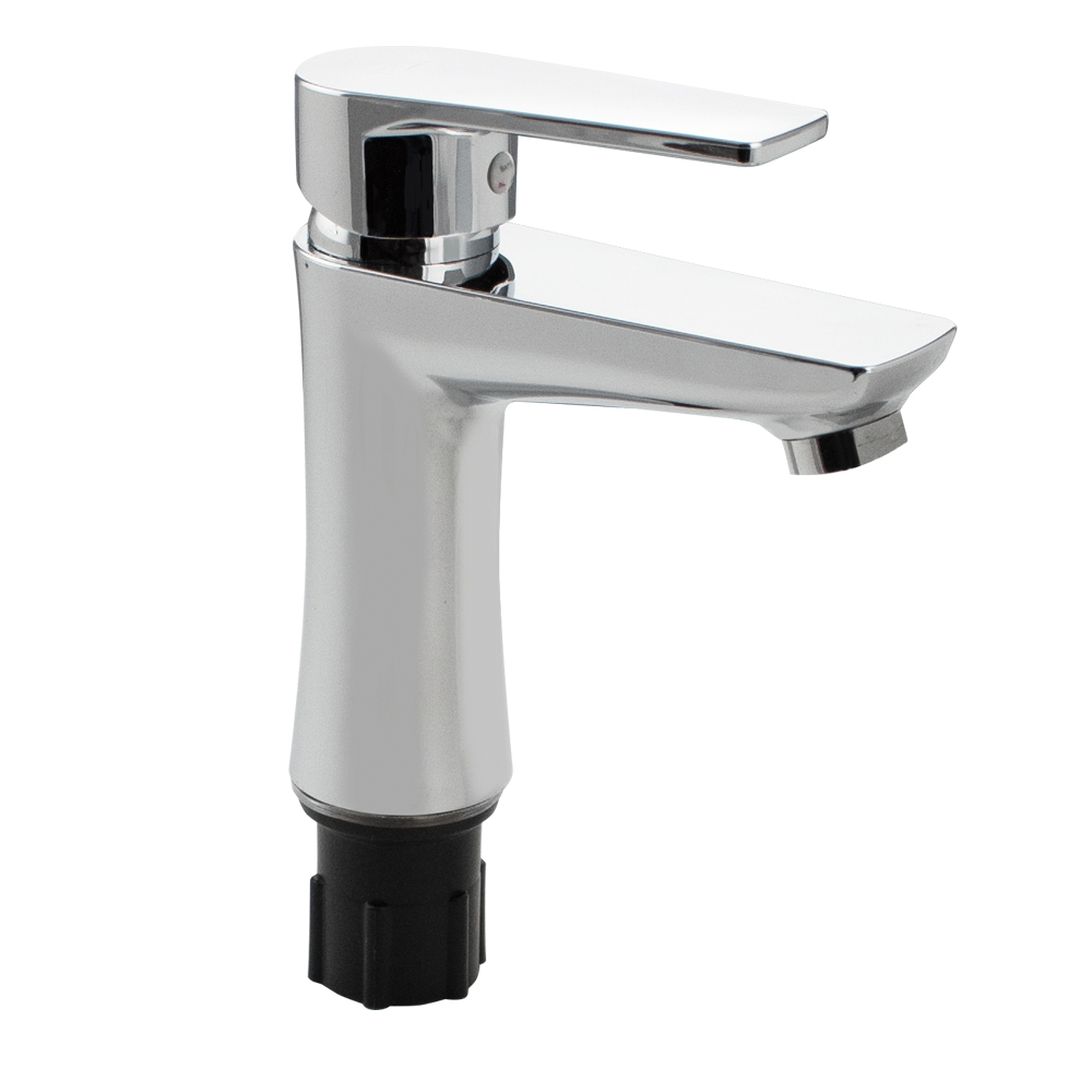 Смеситель для раковины, из высокопрочного пластика АБС, ХРОМИРОВАННЫЙ с коротким изливом, литой корпус, литая ручка, шаровый. Крепление резьба - гайка, картридж d = 40 мм, хромированный, аэратор для экономии воды. Габаритные размеры: высота 160 мм, длина 145 мм, длина излива 105 мм, диаметр посадочного седла 50 мм, длина резьбы 50 мм, длина подводки 400 мм. Вес - 0,650 кг, объём - 0,00417 м3. В комплекте паспорт, корпус, пластиковая подводка с латунными штуцерами 1/2, крепеж, набор прокладок.