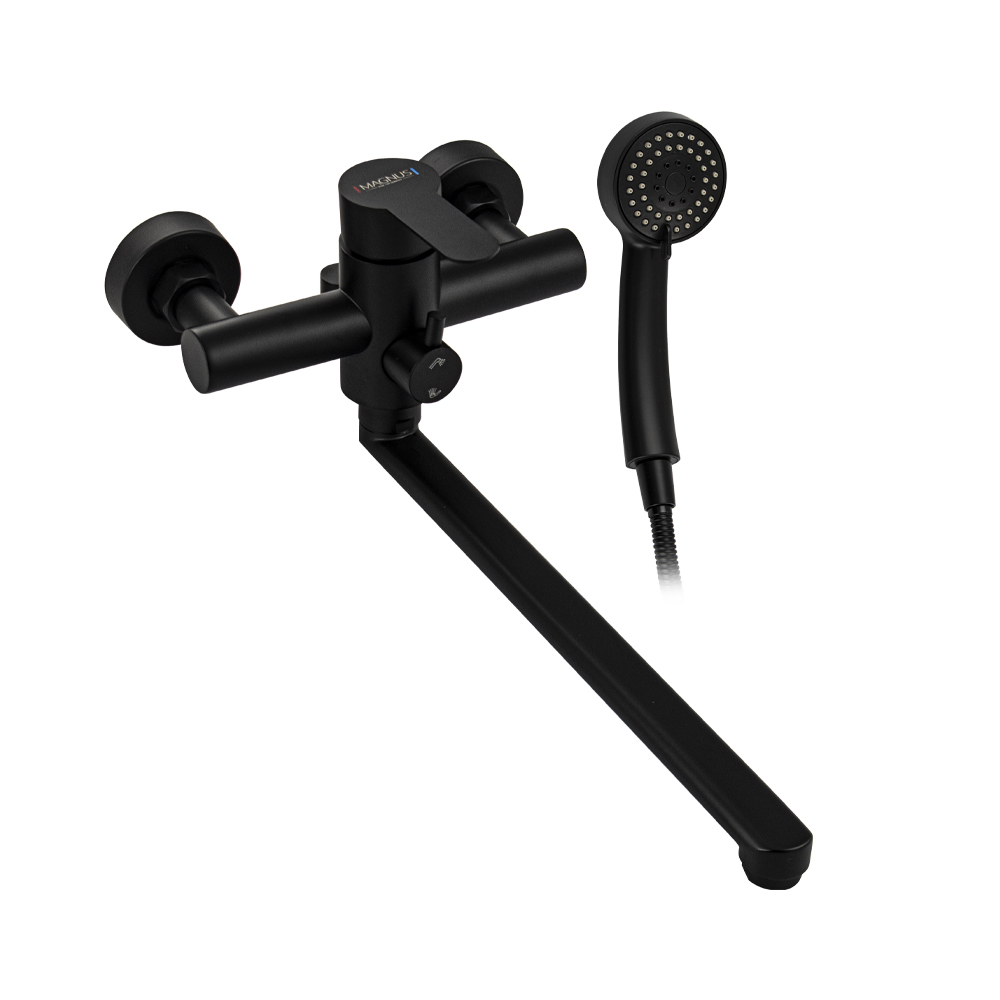 Смеситель цвет черный, из нержавеющей стали марки 304 в ванную / душевую комнату, с поворотным длинным плоским изливом. Картридж d = мм, ручка литая. Дутый, большой круглый корпус с дивертором м/к на корпусе, аэратор для экономии воды, чашки, гайки и эксцентрики из нержавеющей стали. Габаритные размеры: ширина 150 мм, высота 140 мм, длина излива 340 мм, диаметр чашки 60 мм, длина шланга 150 см, лейка d = 80 мм. Вес - 1.89 кг, объём - 0.00757 м3. В комплекте корпус с изливом, дивертор, кронштейн, паспорт, крепёж, прокладки, лейка, шланг.