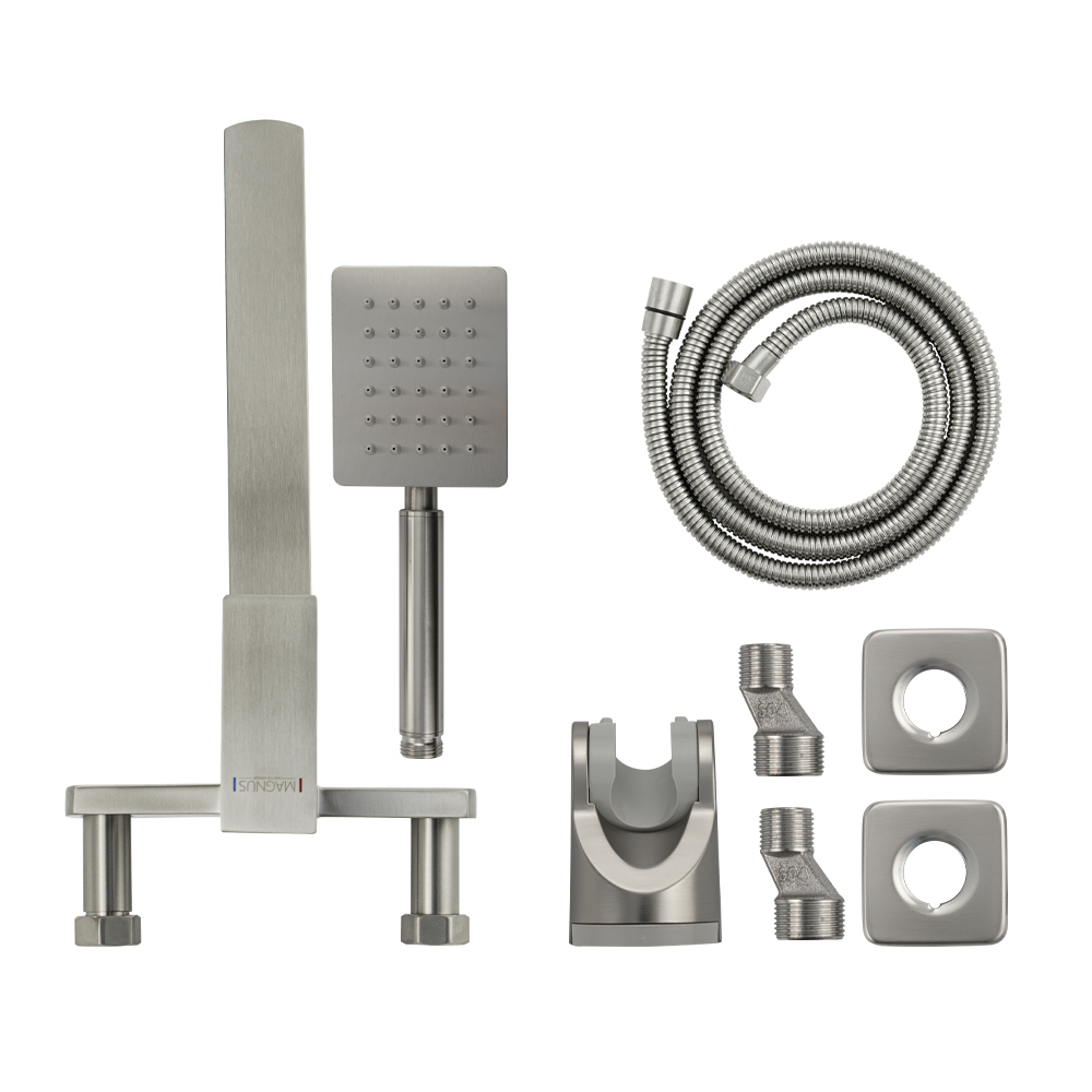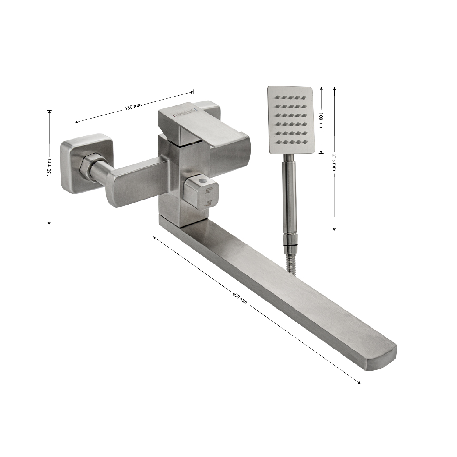 Смеситель матовый, из нержавеющей стали марки 304 в ванную / душевую комнату, с поворотным длинным плоским изливом. Картридж d = 35 мм, ручка литая. Квадратный, большой корпус с дивертором м/к на корпусе, аэратор для экономии воды, чашки, гайки и эксцентрики из нержавеющей стали. Габаритные размеры: ширина 150 мм, высота 145 мм, длина 190 мм, длина шланга 150 см, лейка d = мм. Вес - 2,98 кг, объём - 0,01204 м3. В комплекте корпус с изливом, дивертор, кронштейн, паспорт, крепёж, прокладки, лейка, шланг.