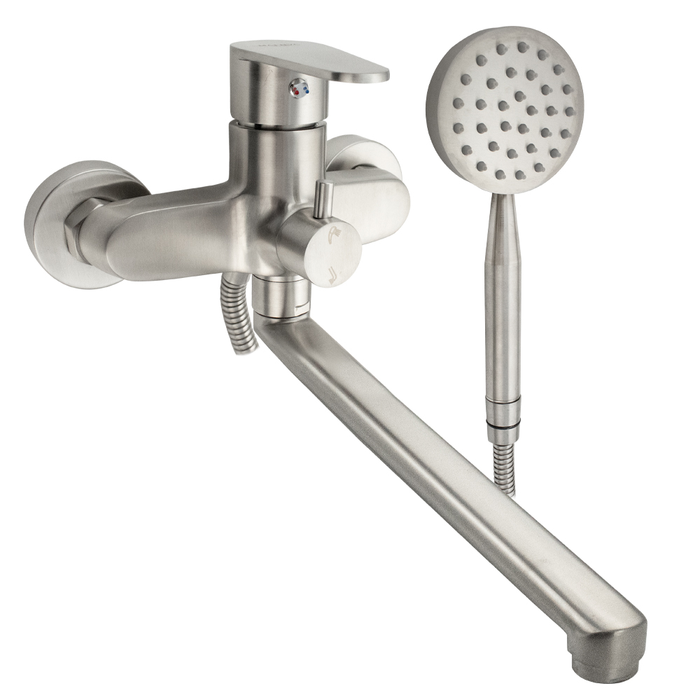 Смеситель матовый, из нержавеющей стали марки 304 в ванную / душевую комнату, с поворотным длинным плоским изливом. Картридж d = 40 мм, ручка литая. Дутый, большой корпус с дивертором м/к на корпусе, аэратор для экономии воды, чашки, гайки и эксцентрики из нержавеющей стали. Габаритные размеры: ширина 150 мм, высота 140 мм, длина излива 330 мм, диаметр чашки 60 мм, длина шланга 150 см, лейка d = 85 мм. Вес - 2,200 кг, объём - 0,00865 м3. В комплекте корпус с изливом, дивертор, кронштейн, паспорт, крепёж, прокладки, лейка, шланг.