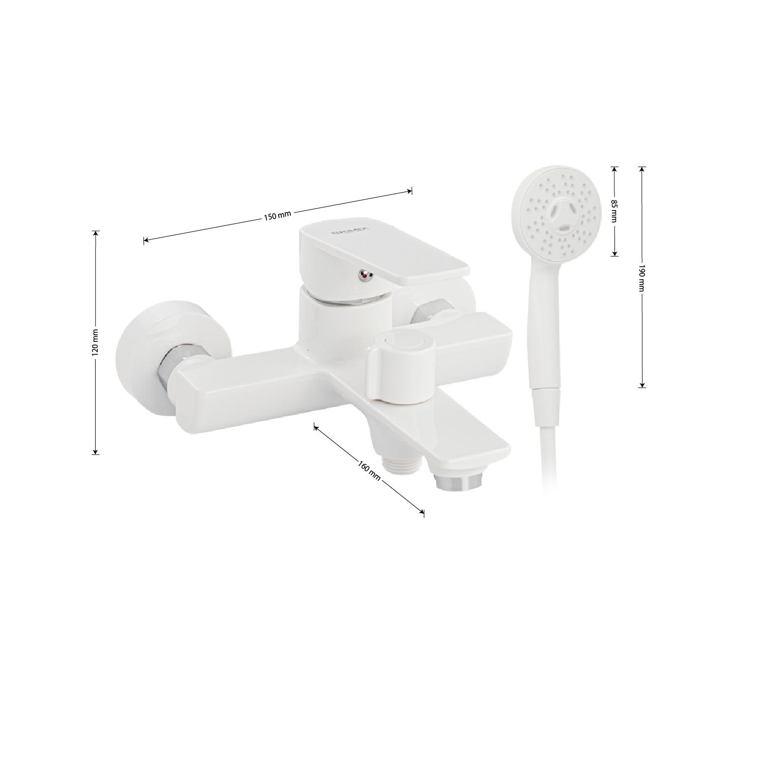 Смеситель из высокопрочного пластика АБС, БЕЛЫЙ в ванную / душевую комнату с коротким изливом, литой корпус, шаровый, с дивертором м/к на корпусе. Картридж d = 40 мм, литая ручка, хромированный аэратор для экономии воды, хромированные чашки и эксцентрики. Габаритные размеры: ширина 150 мм, высота корпуса 120 мм, длина 160 мм, душевая лейка d = 85 мм, шланг 150 см. Вес - 1,062 кг, объём - 0,0045 м3. В комплекте паспорт, корпус с изливом, душевая лейка, шланг, кронштейн, комплект крепежа и прокладок.