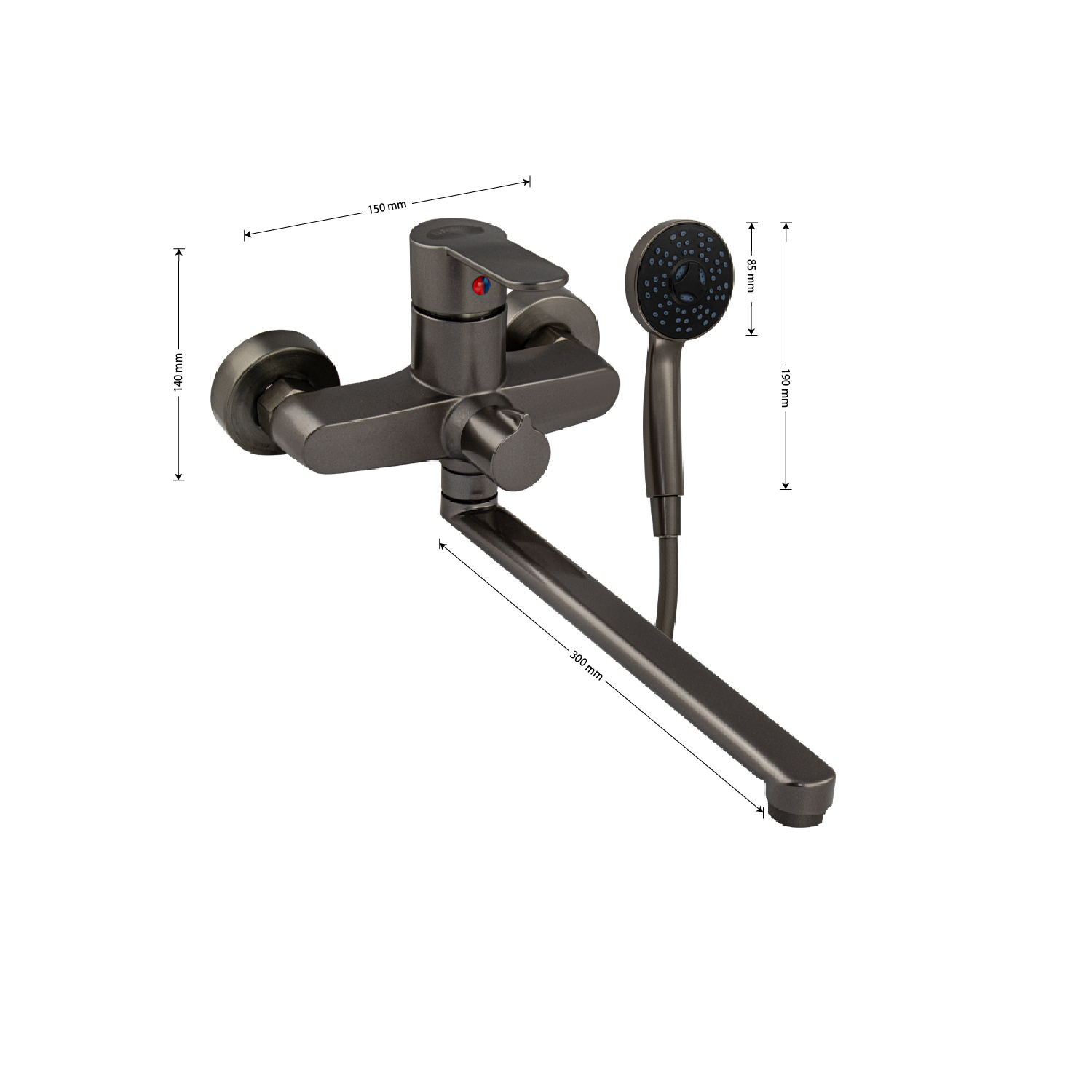 Смеситель из высокопрочного АБС пластика, цвета графит, в ванную / душевую комнату с длинным, плоским изливом, литой корпус, шаровый с дивертором м/к на корпусе. Картридж d = мм, литая ручка, хромированный, аэратор для экономии воды, хромированные чашки и эксцентрики. Габаритные размеры: ширина 150 мм, высота корпуса 140 мм, длина излива 300 мм, душевая лейка d = 85 мм, шланг 150 см. Вес - кг, объём - м3. В комплекте паспорт, корпус с изливом, дивертор, душевая лейка, шланг, кронштейн, комплект крепежа и прокладок.