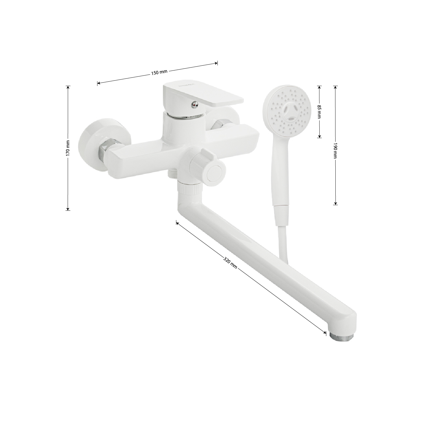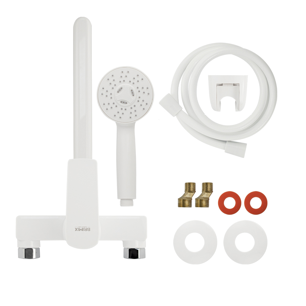 Смеситель из высокопрочного пластика АБС, БЕЛЫЙ в ванную / душевую комнату с длинным, плоским изливом, литой корпус, шаровый с дивертором м/к на корпусе. Картридж d = 40 мм, литая ручка, хромированный, аэратор для экономии воды, хромированные чашки и эксцентрики. Габаритные размеры: ширина 150 мм, высота корпуса 170 мм, длина излива 320 мм, душевая лейка d = 85 мм, шланг 150 см. Вес - 1,118 кг, объём - 0,0061 м3. В комплекте паспорт, корпус с изливом, дивертор, душевая лейка, шланг, кронштейн, комплект крепежа и прокладок.