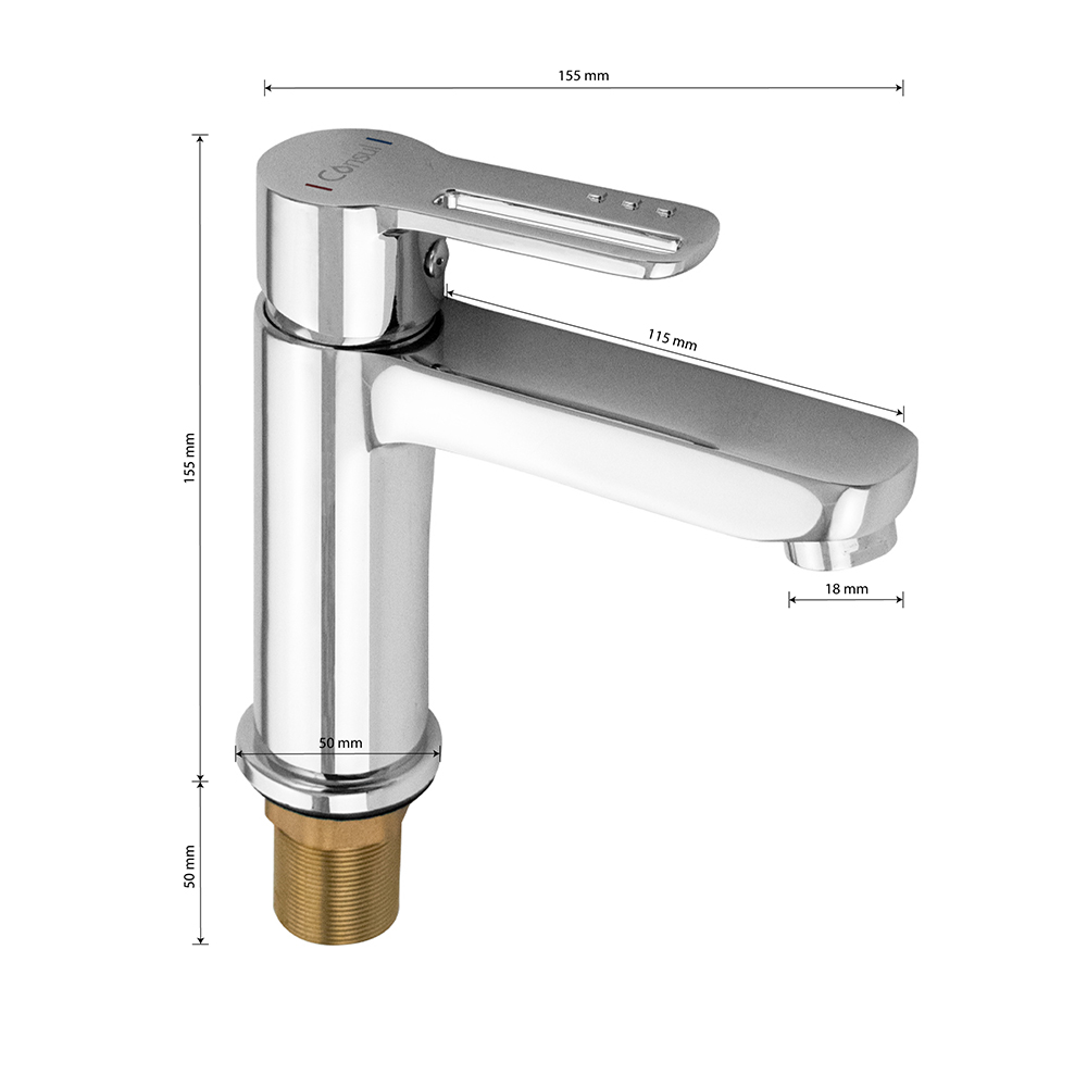 Смеситель для раковины, хромированный, с коротким изливом, литой корпус, ручка с прорезью, шаровый. Материал изготовления — ЦАМ (цинк-алюминий-медь) + нержавеющая сталь. Крепление резьба - гайка, картридж d = 35 мм. Аэратор для экономии воды. Габаритные размеры: высота 155 мм, длина 155 мм, длина излива 115 мм, диаметр посадочного седла 50 мм, длина резьбы 50 мм, длина подводки 400 мм. Вес - 1,000 кг, объём - 0,00295 м3. В комплекте паспорт, корпус, подводка 1/2, крепеж, набор прокладок. Габаритные размеры коробки: ширина 200 мм, высота 80 мм, глубина 150 мм.