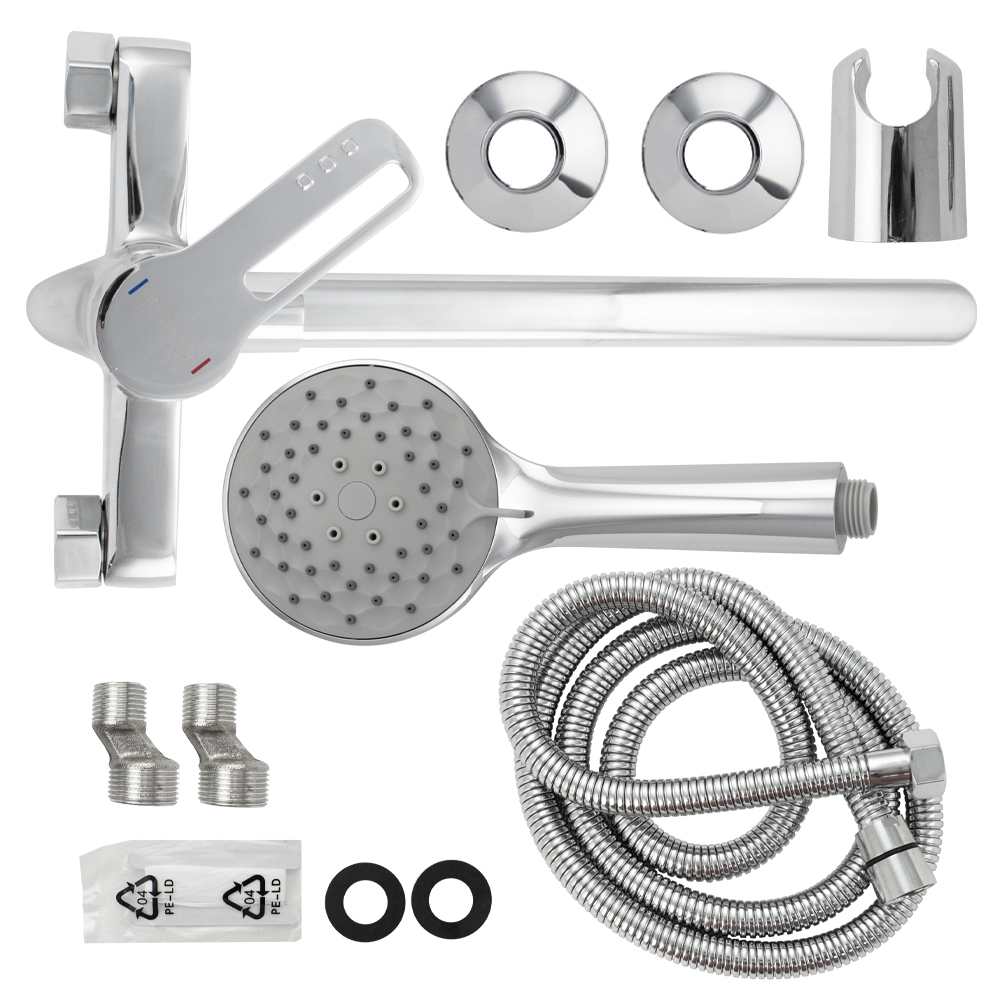Смеситель хромированный в ванную / душевую комнату с длинным, плоским изливом, тяжёлый, массивный корпус, шаровый с дивертором м/к на корпусе. Материал изготовления — ЦАМ (цинк-алюминий-медь) + нержавеющая сталь. Картридж d = 35 мм, ручка с прорезью, аэратор для экономии воды, чашки и эксцентрики из нержавеющей стали. Габаритные размеры: ширина 150 мм, высота корпуса 140 мм, длина излива 330 мм, двухрежимная душевая лейка d = 105 мм, шланг 150 см. Вес - 1,900 кг, объём - 0,00740 м3. В комплекте паспорт, корпус с изливом, дивертор, душевая лейка, шланг, кронштейн, комплект крепежа и прокладок. Габаритные размеры коробки: ширина 395 мм, высота 105 мм, глубина 170 мм.