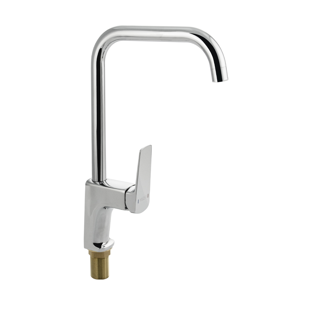Смеситель для кухонной мойки и раковин, латунный квадратный корпус, хромированный, боковой, с высоким С-образным изливом, шаровый. Крепление резьба - гайка, картридж d = 40 мм, литая ручка. Аэратор для экономии воды. Габаритные размеры: высота 360 мм, длина 230 мм, размер посадочного седла 45 мм, длина резьбы 50 мм, длина подводки 500 мм. Вес - 1,400 кг, объём - 0,00800 м3. В комплекте паспорт, корпус с изливом, подводка 1/2, крепеж, набор прокладок.